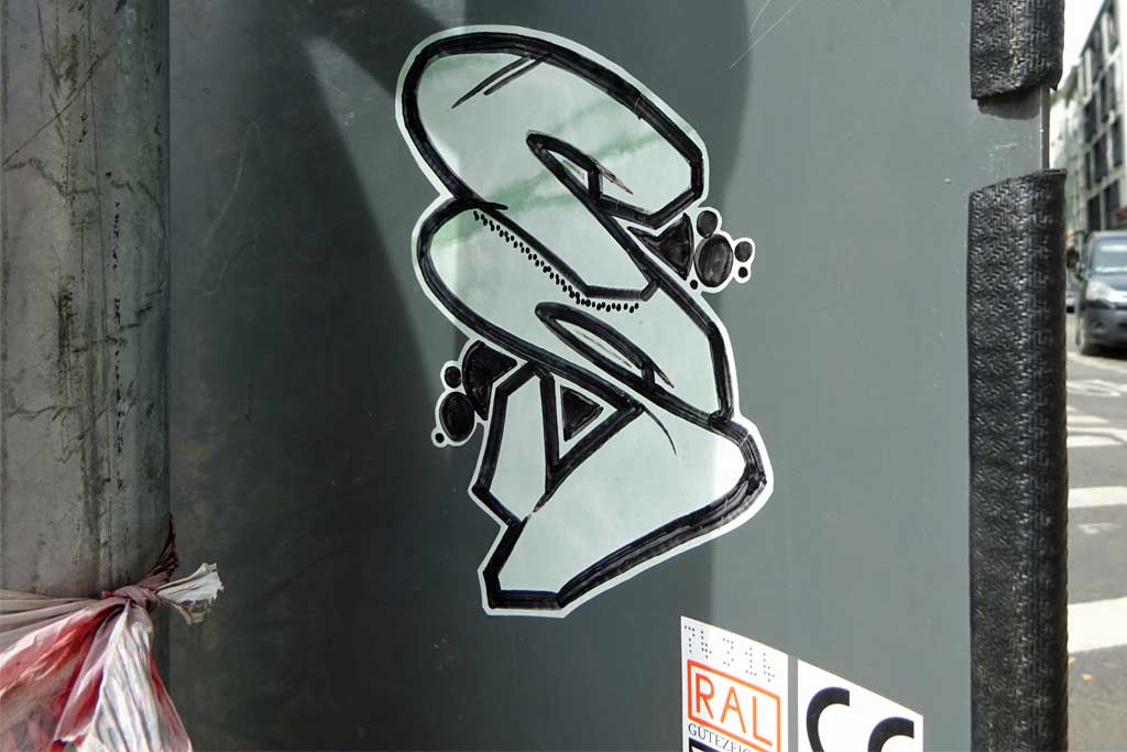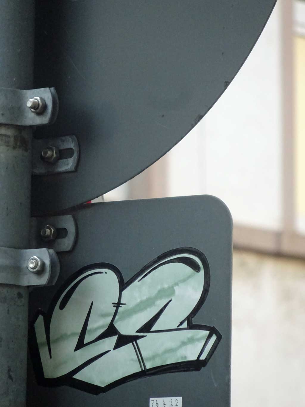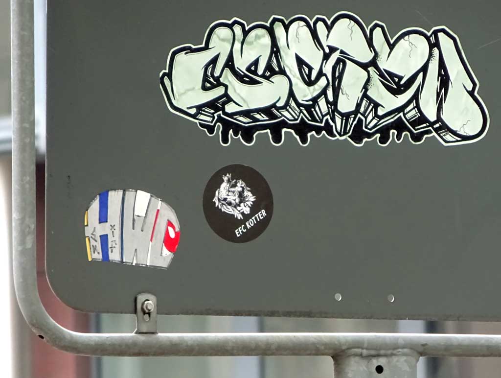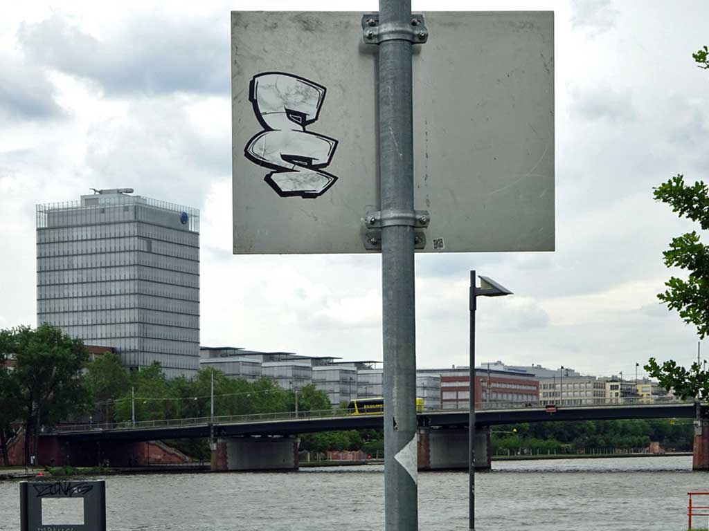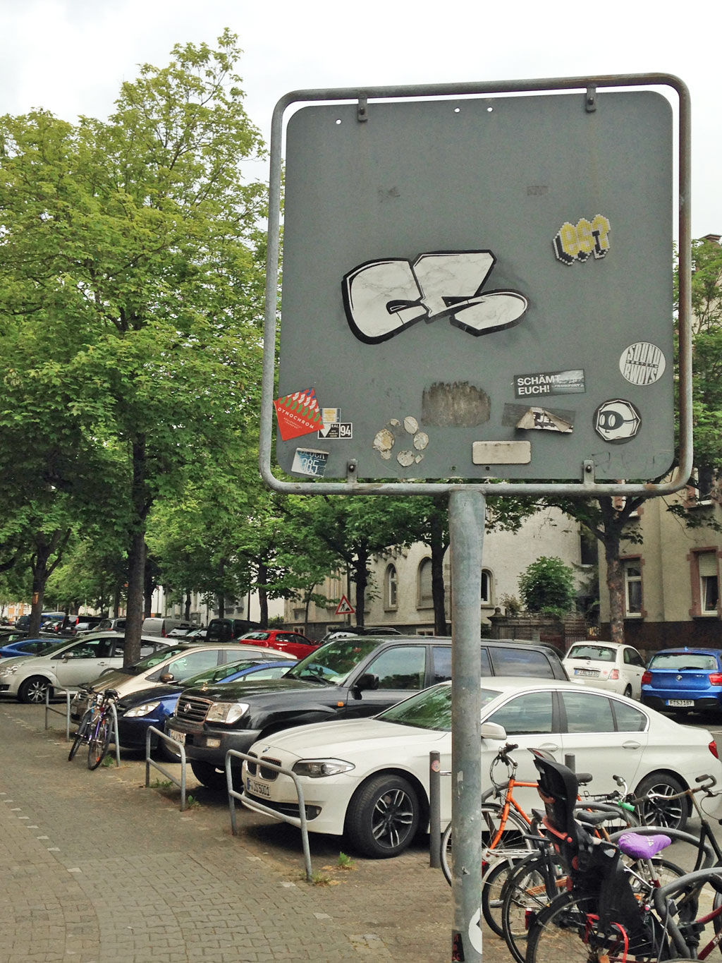 In den letzten zwei, drei Monaten des Öfteren in Frankfurt gesehen: Sticker der CS Crew, zumeist in Form von zwei freigestellten Buchstaben im Graffitistyle. Angebracht waren die Sticker bisher immer auf den Rückseiten von Verkehrsschildern.