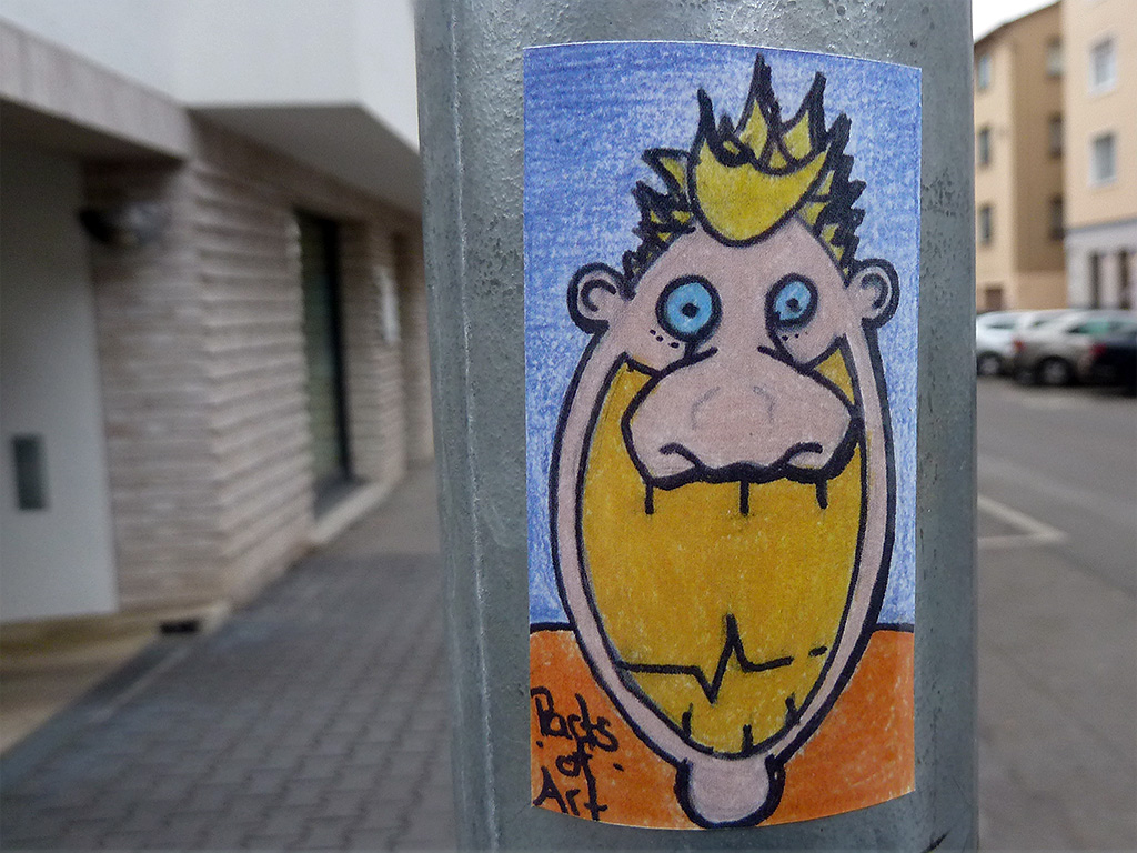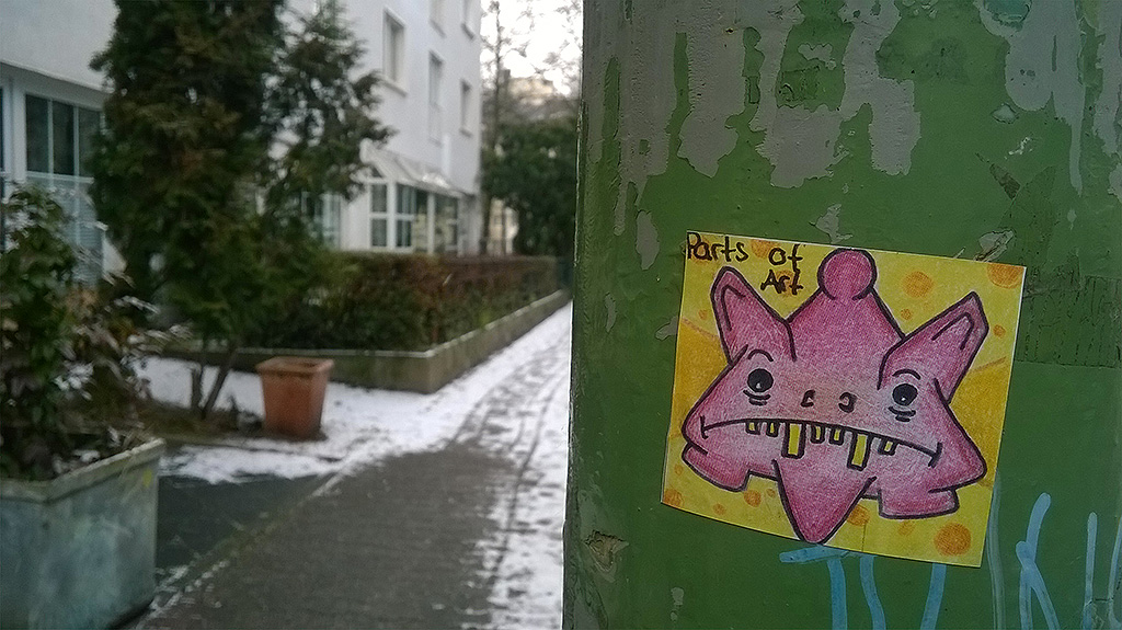In Form von kleinen Aufklebern macht sich ein als „Parts of Art“ bezeichnetes Sammelsurium bunter Fratzen in der Stadt bemerkbar.