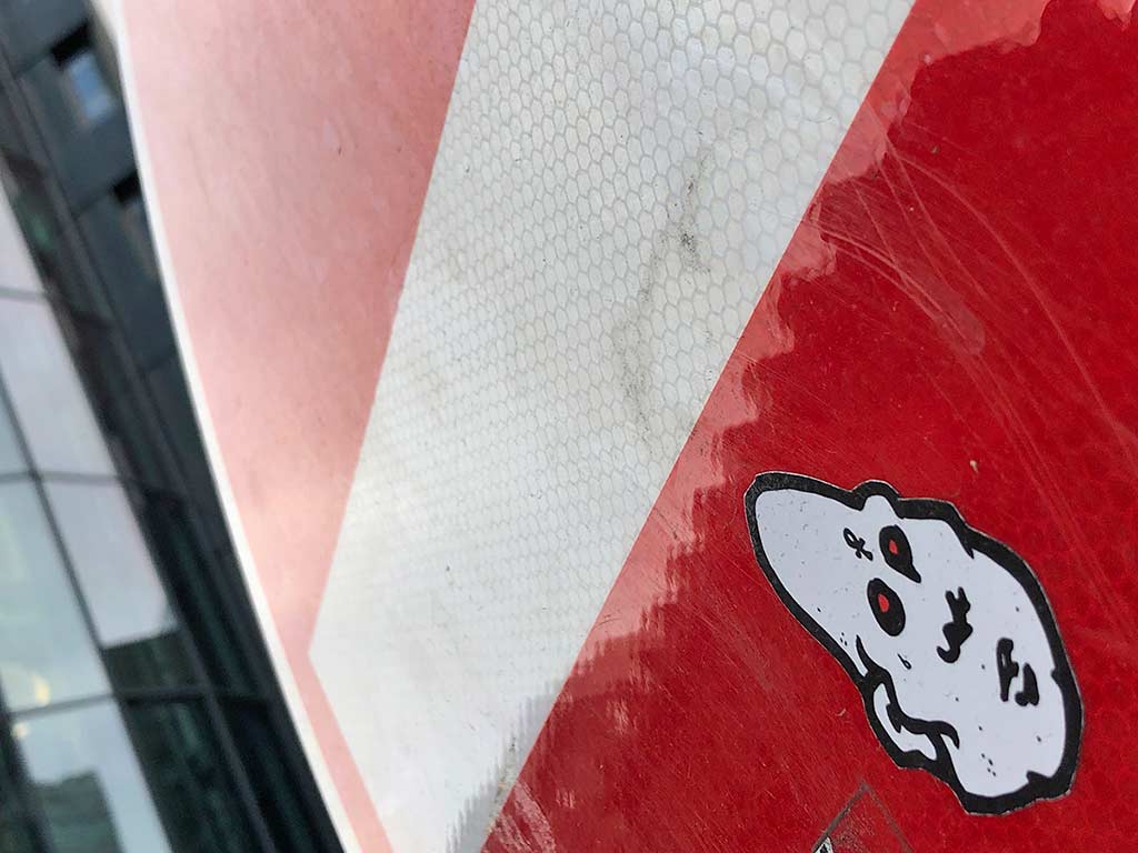Sticker-Streetart in Frankfurt von Arezd aus Hamburg, der nach Angaben im Stickemzine diesbezüglich schon seit 2004 aktiv ist. Aktiv betrieben wird auch ein Instagram-Konto (@arezd_), in dem Fotos von seinen Werken zu sehen sind. Darüber hinaus gibt es auf der E-Commerce-Website Etsy sogar die Möglichkeit Stickerpacks zu erwerben, u. a. auch eines mit den als »Golems« betitelten Köpfen.