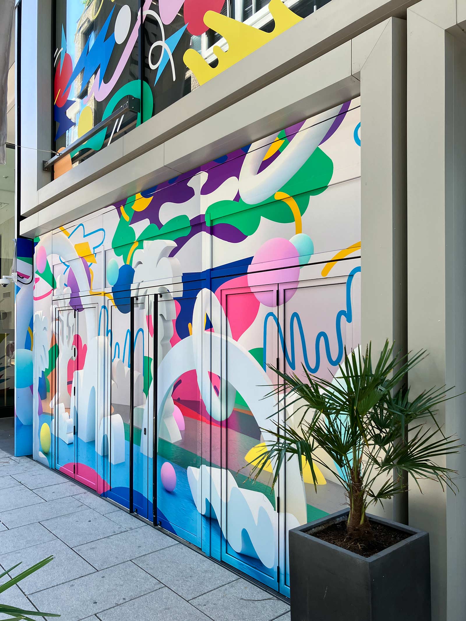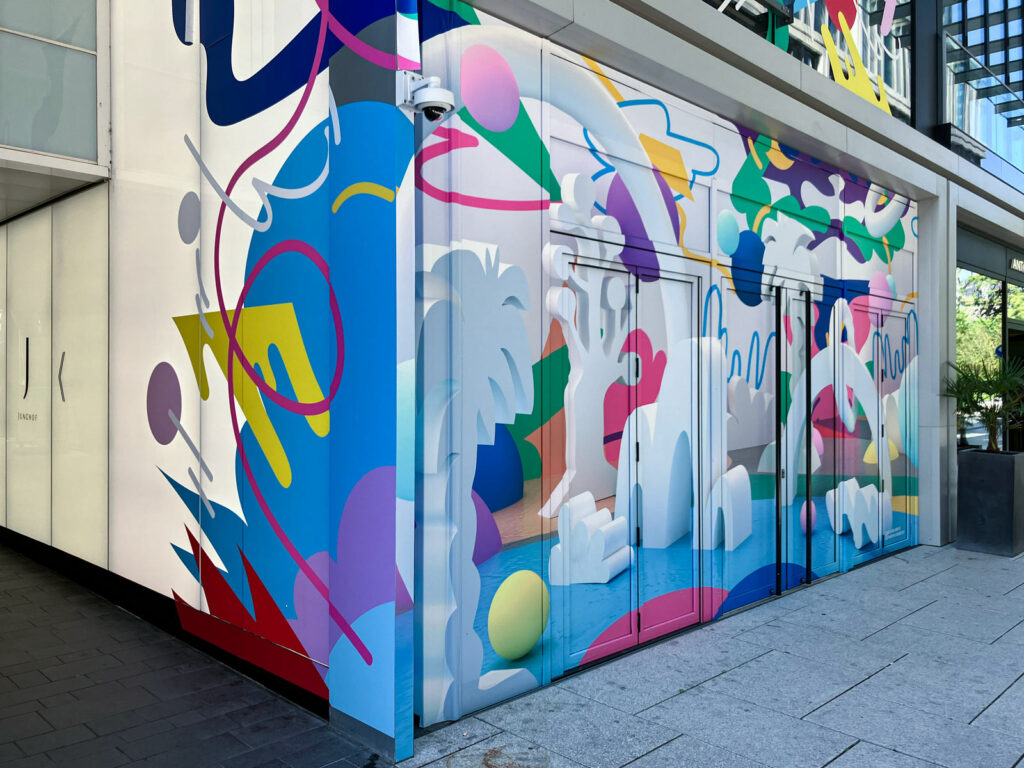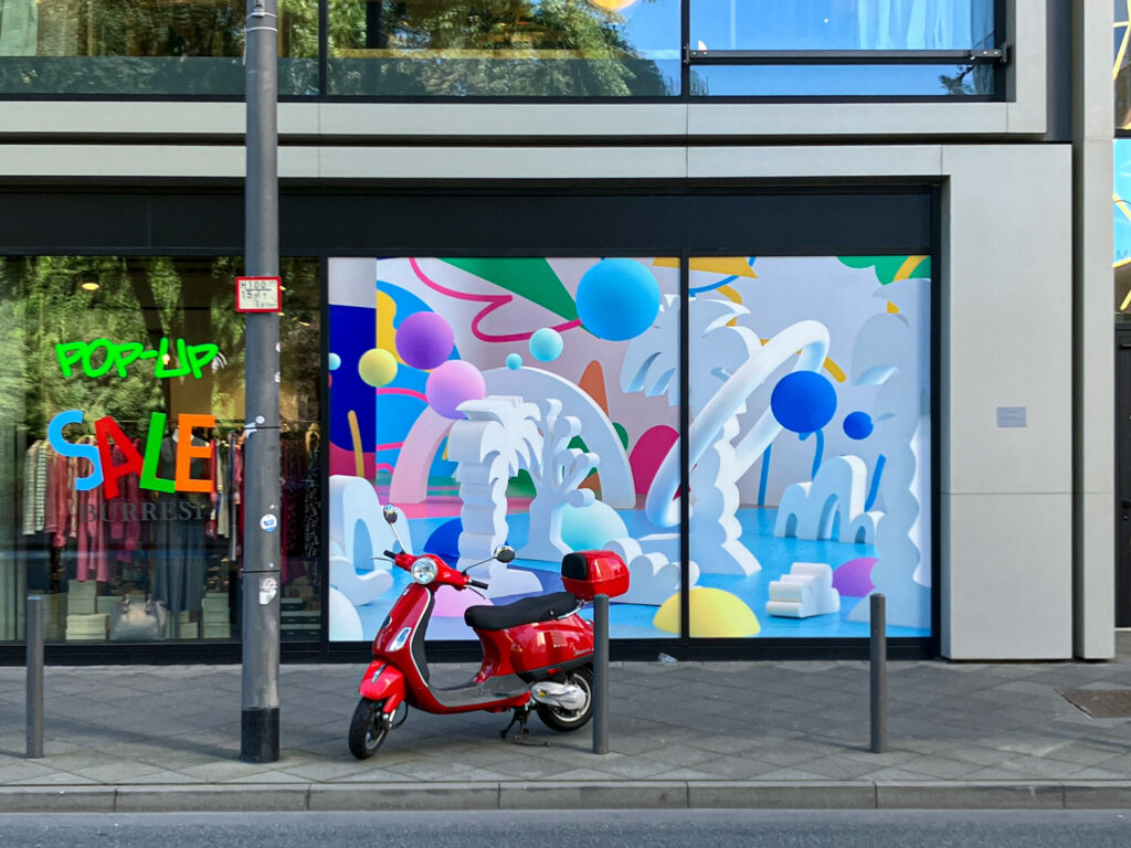 Bereits im November 2023 wurden Schaufenster in der Neuen Rothofstraße und der angrenzenden Neuen Mainzer Straße mit einer Motivwelt der Visual Artist Nadine Kolodziey gestaltet. Davor hatte sie bereits ein Plakat an der Basis in Frankfurt (2020) und ein Wandbild in der S-Bahn-Station Kaiserlei in Offenbach (2023) geschaffen, beide zusätzlich versehen mit einem QR-Code, der nach dem Scannen mit der Smartphonekamera eine Augmented-Reality-Funktionalität aktiviert. Die Arbeiten in der Neuen Rothofstraße sind, wie bereits ihre erste Arbeit dort (2021), als Selfie Spot konzipiert. Die Fotos habe ich neulich erst gemacht. In ihrem Instagram-Feed ist zu sehen, dass dort ursprünglich sogar noch weitere Flächen damit gestaltet wurden.