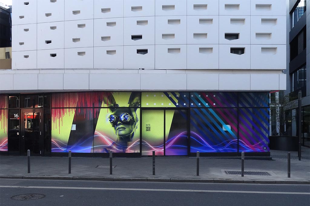 „We activate vacant storefronts around the world“ heißt es auf der Website von 3DWD, einem Kreativdienstleister mit Fokus auf innovative Lösungen für Handel und Immobilen. Aktuell zu sehen ist eine solche Arbeit in der Frankfurter Innenstadt, nämlich an der um die Ecke von Stiftstraße und Große Eschenheimer Straße verlaufenden Glasfront am Flare of Frankfurt, in dem Residence Inn und Moxy Hotel beheimatet sind.