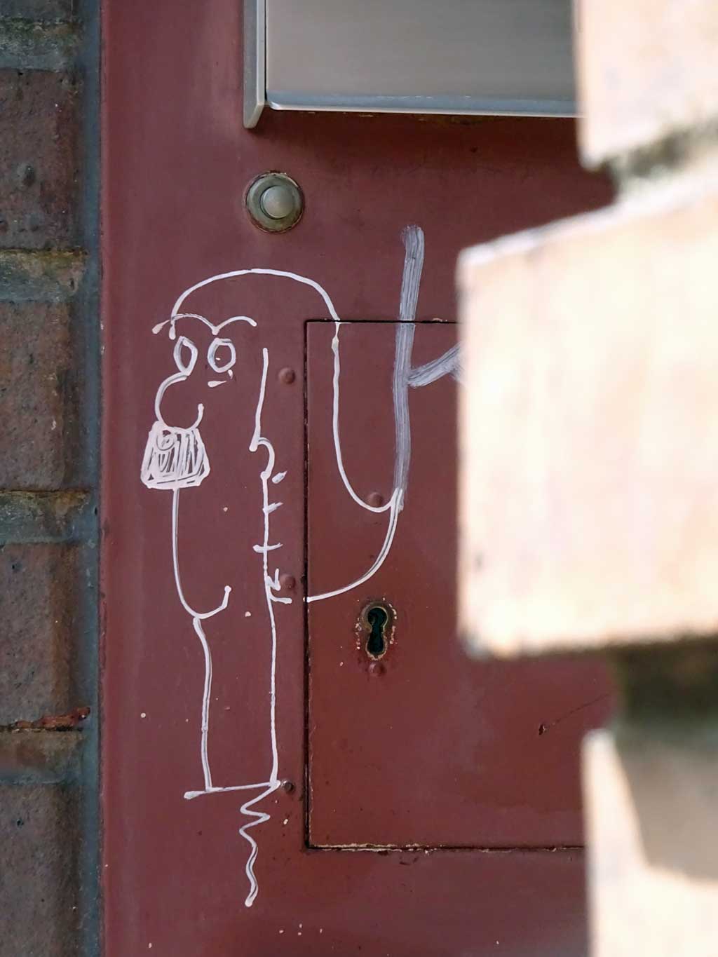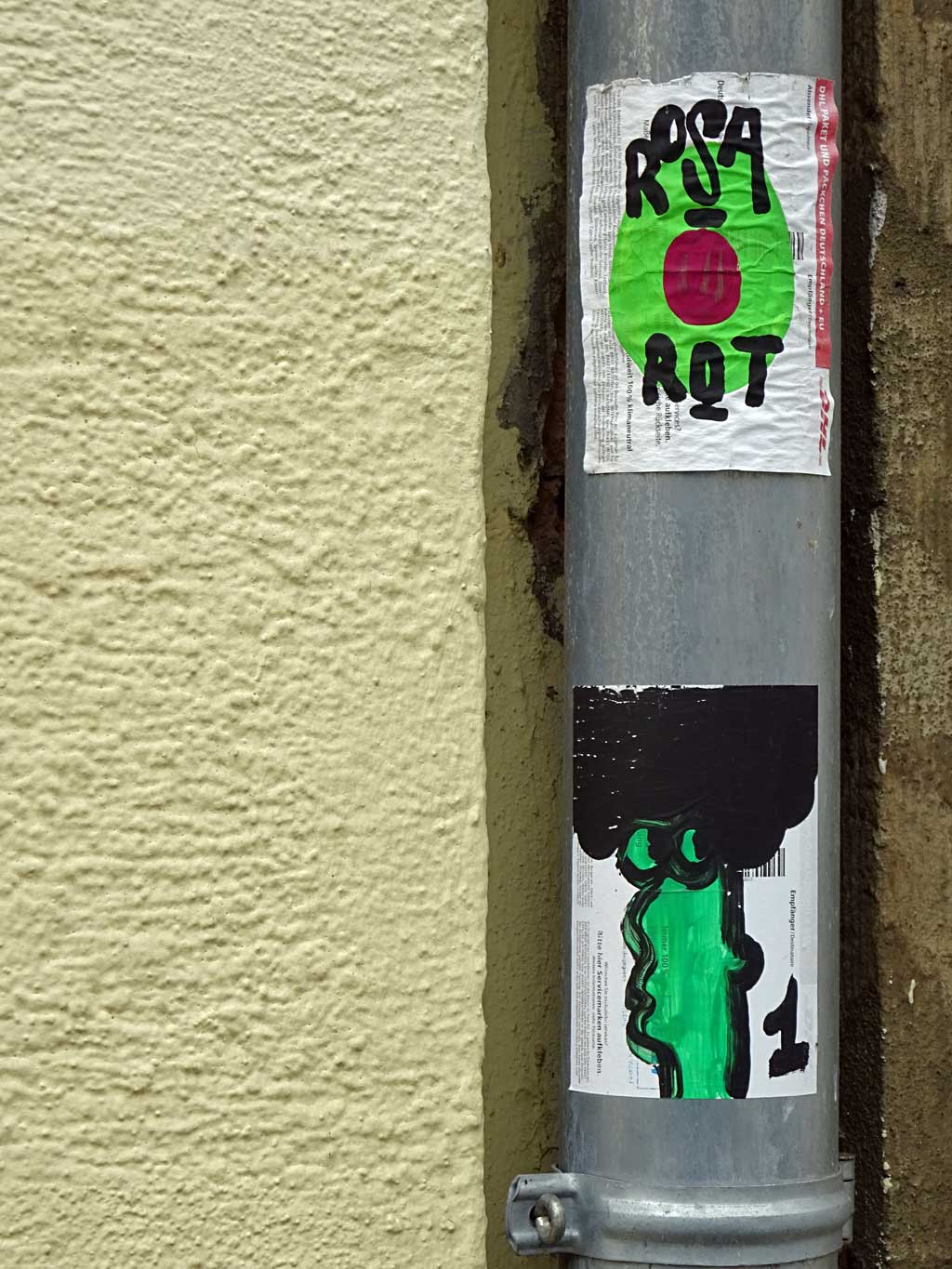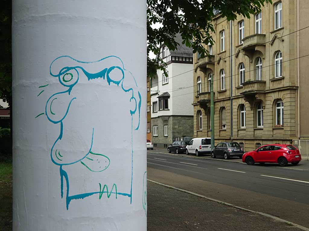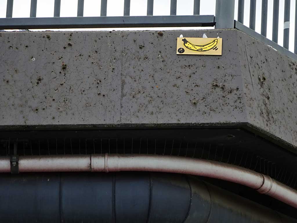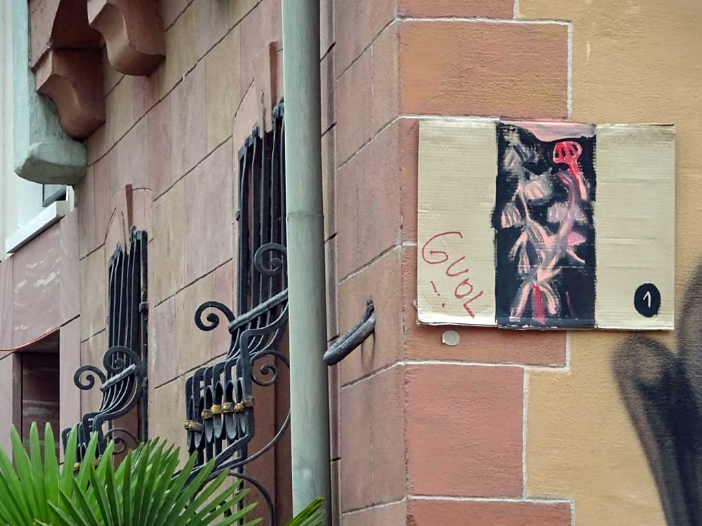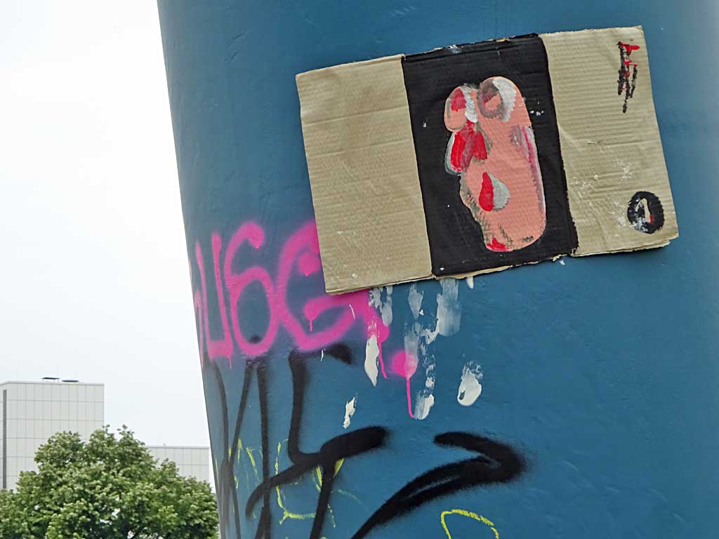 Seit Juni vergangenen Jahres ist das nun schon sechste Beitrag hier im Blog, in dem das Schaffen von Treppe 1. OG dokumentiert wird. Besonders Versandaufkleber und Kartons werden als Träger von Ideen umfunktioniert und mit Skizzen und Malereien dem öffentlichen Raum übergeben. Wiederkehrende Motive sind Bananen und Gesichter.