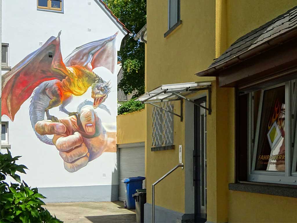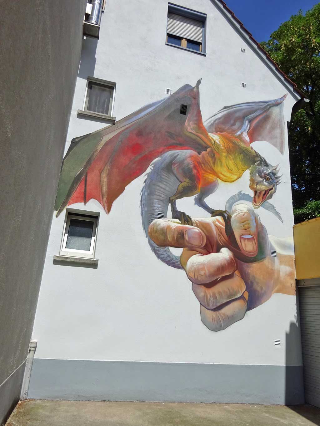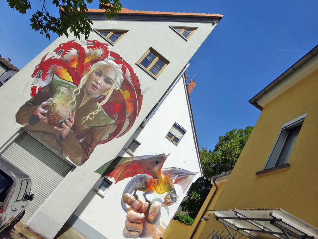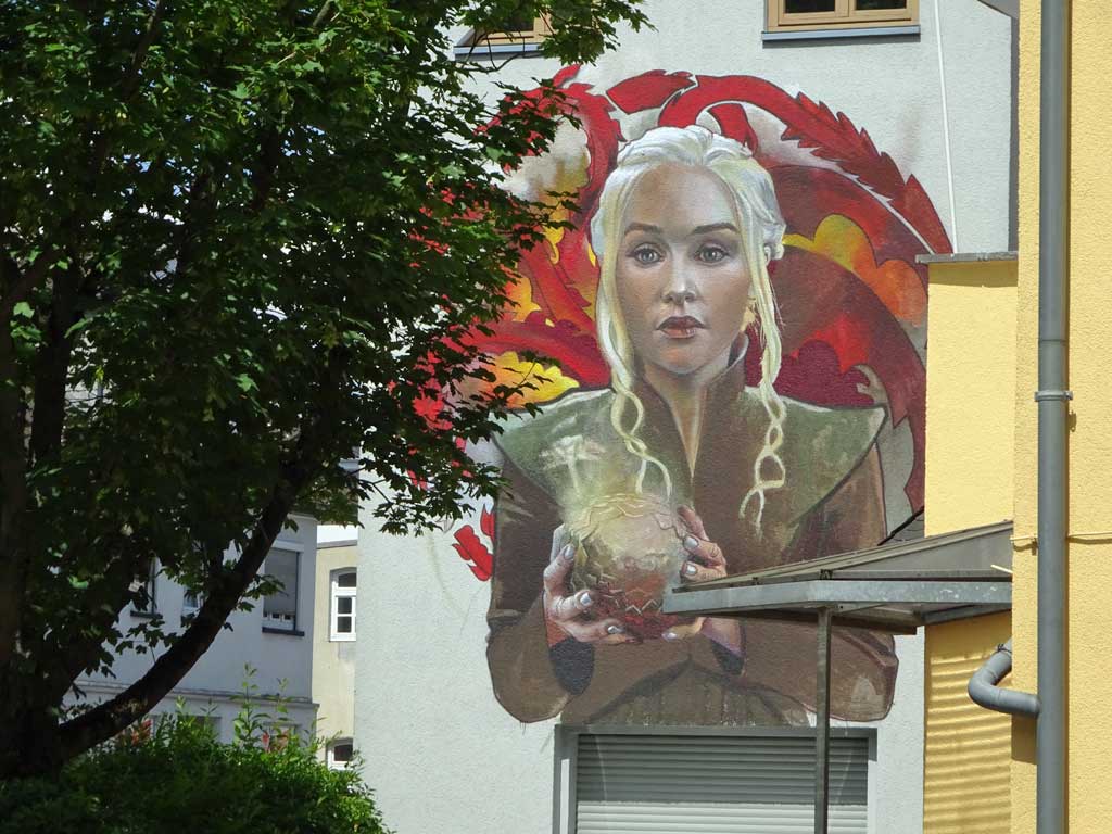 Der Graffitikünstler Andreas von Chrzanowski, auch bekannt als Case oder Case Ma‘Claim, hat beim diesjährigen Quellenfest in Bad Vilbel wieder ein Mural gemalt. Neben der für seine Werke typischen Hand, besteht sein neues Wandbild auch aus zwei Figuren der populären Serie „Game of Thrones“.