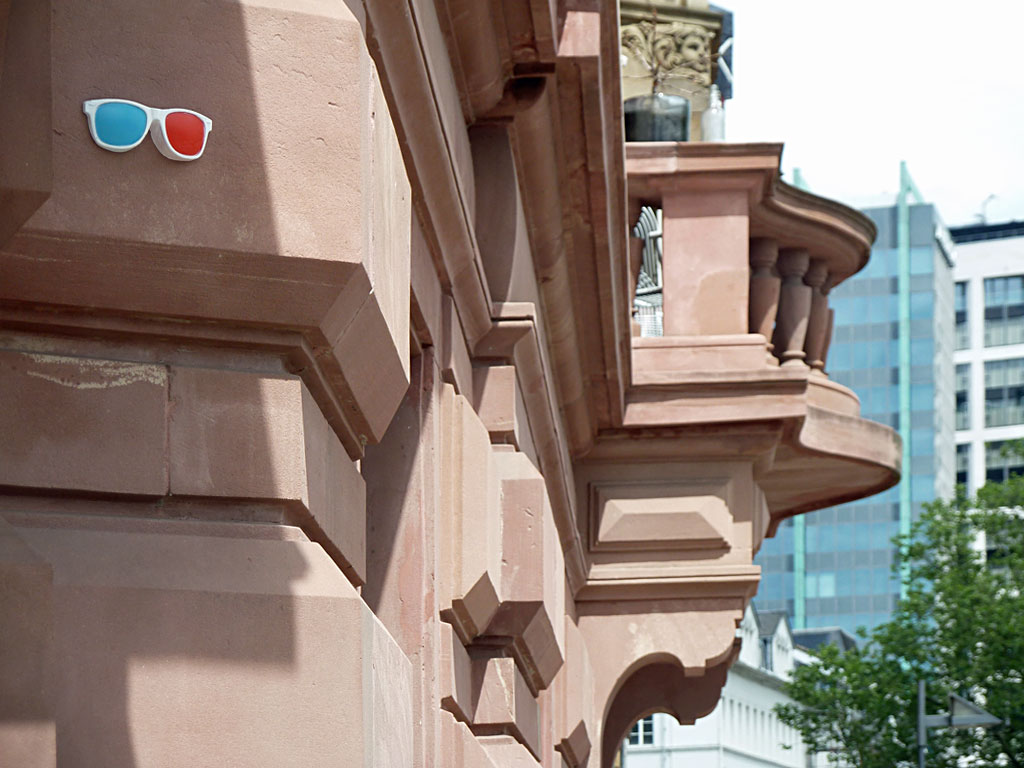 Aufkleber und Arbeiten mit Sprühschablonen, sogenannte Stencils, dürften die Art von Streetart sein, der man in Frankfurt am häufigsten begegnet. Paste-Ups, also auf Kleister aufgezogene Plakate, sind da schon seltener, ebenso Werke mit Holz als Träger von Ideen. Ungewöhnlich mutet von daher die 3D-Brille von Eisk (auch Eisk One) an, die man seit einigen Monaten in Frankfurt entdecken kann.