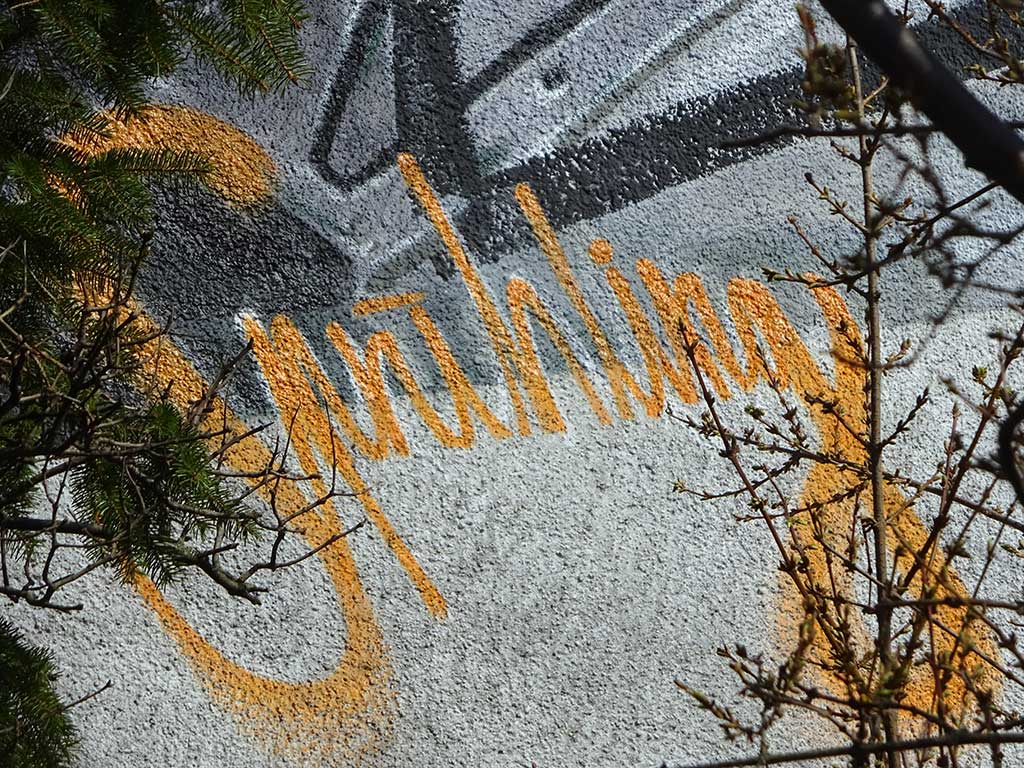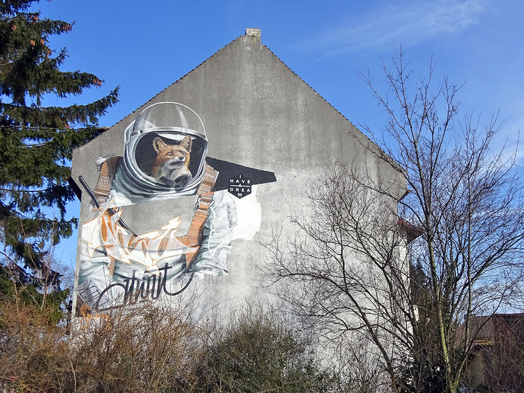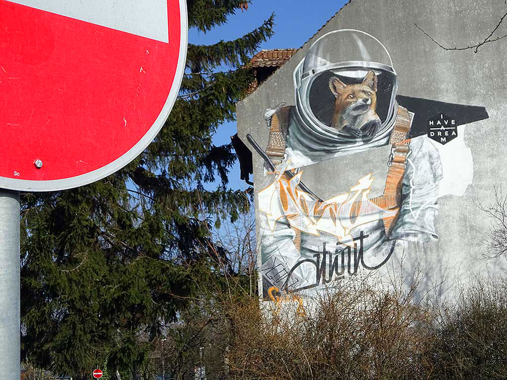 Ein Fuchs im Anzug eines Astronauten, dazu ein „I have a dream“-Zitat und – sofern ich das richtig gelesen habe – eingearbeitete Worte die sich zusammenhängend als „What about Sprühling“ lesen lassen könnten. Keine Ahnung, ob das so verstanden werden soll, Künstler oder Künstlerin sind mir nicht bekannt und auch das Web hatte zwar einige Fuchs x Astronaut-Motive („Spacefox“, „Foxtronaut“ etc.) im Angebot, jedoch nichts konkretes in Bezug auf das Mural in Hattersheim.
