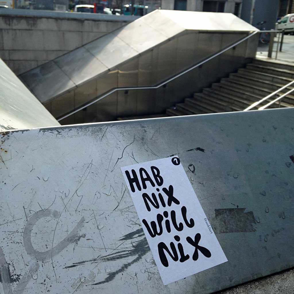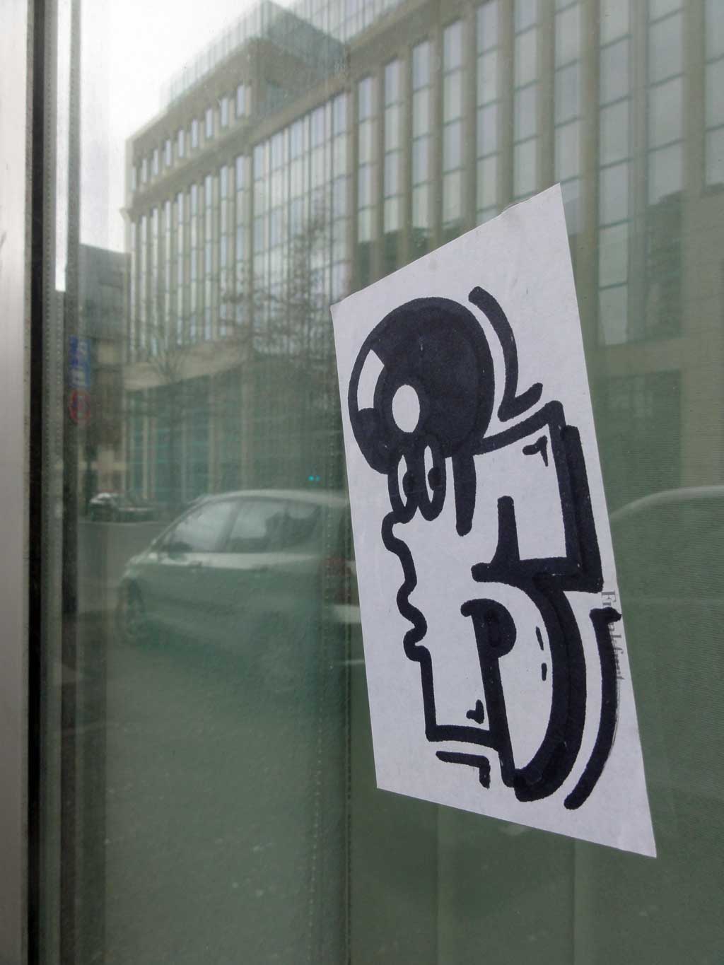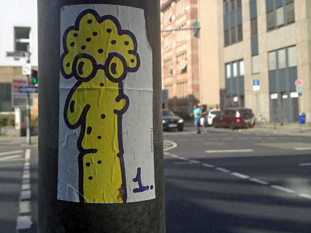Ungefähr seit Februar 2016 sehe ich vermehrt von diesen Dudes mit den länglichen Köpfen, ergänzt durch die Zahl „1“ oder auch zusammen mit Wörtern wie z.B. „Beton“ oder „Treppe“. Die Nutzung von „Treppe 1“ bzw. „Treppe 1. OG“ (so auch die Bezeichnung des gleichnamigen Instagram-Kontos) scheint sich hierbei im Laufe der Zeit durchgesetzt zu haben, zumindest bei Stickern, die ich im Frankfurter Stadtgebiet, und hier besonders oft rund um die Ateliers der Basis in der Elbestraße und dem Städel Museum am Schaumainkai, entdecken konnte.