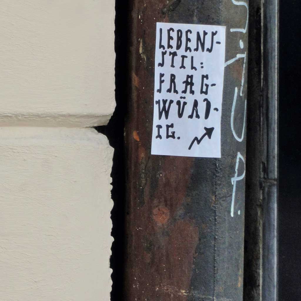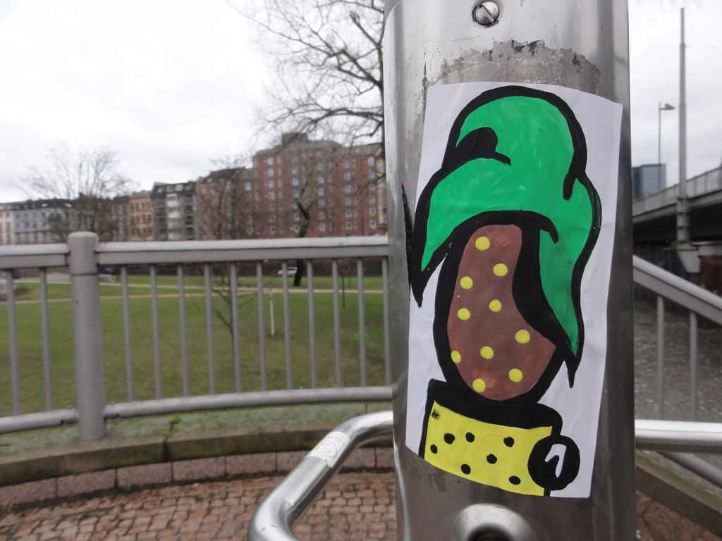 Stilistisch fühlt man sich gelegentlich an die Ill Zoo Crew erinnert, aber was will das schon heißen, wenn man mitbekommt, wie in den vergangenen Jahren nicht originale Cityghost– und 1UP-Graffiti aufgetaucht sind und generell Streetart- und Graffiti-Werke, die nicht an andere Streetart-Künstler_innen oder Stile erinnern, rar gesät sein dürften – wer da mal anfängt zu schauen, wo wann wer wie zuerst mit bestimmten Details, Objekten, Stilen etc. am Start war, verliert sich schnell in einer Welt von Cartoons, Comics, Graffiti, Illustrationen, Streetart und Tattoos. Wie dem auch sei, neben den Stickerdudes halten auch immer wieder andere Objekte als Motiv her…