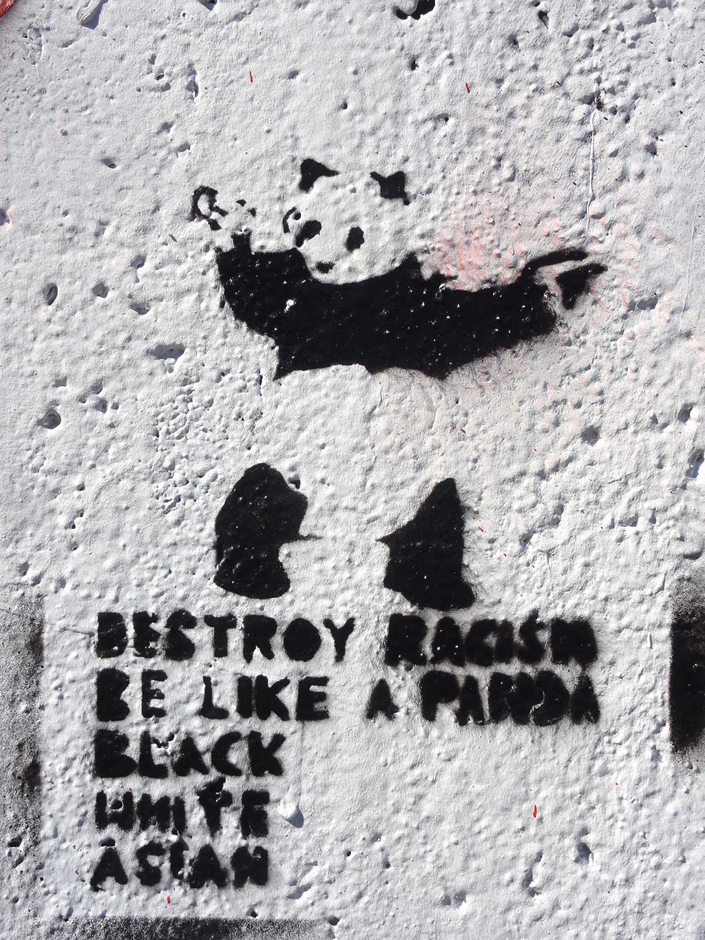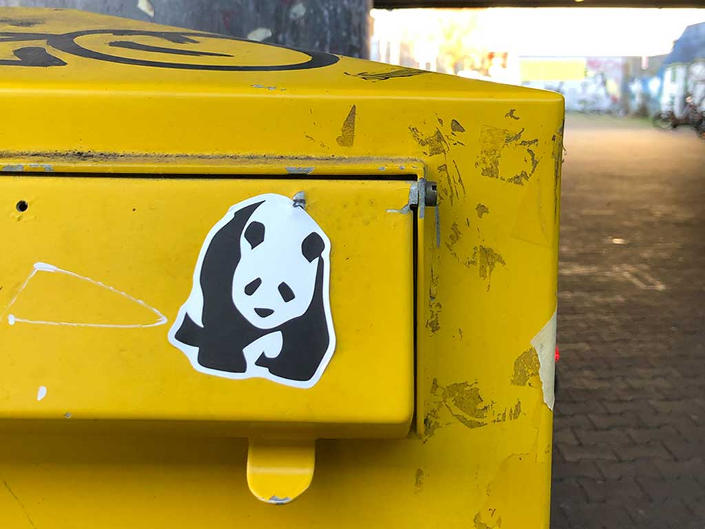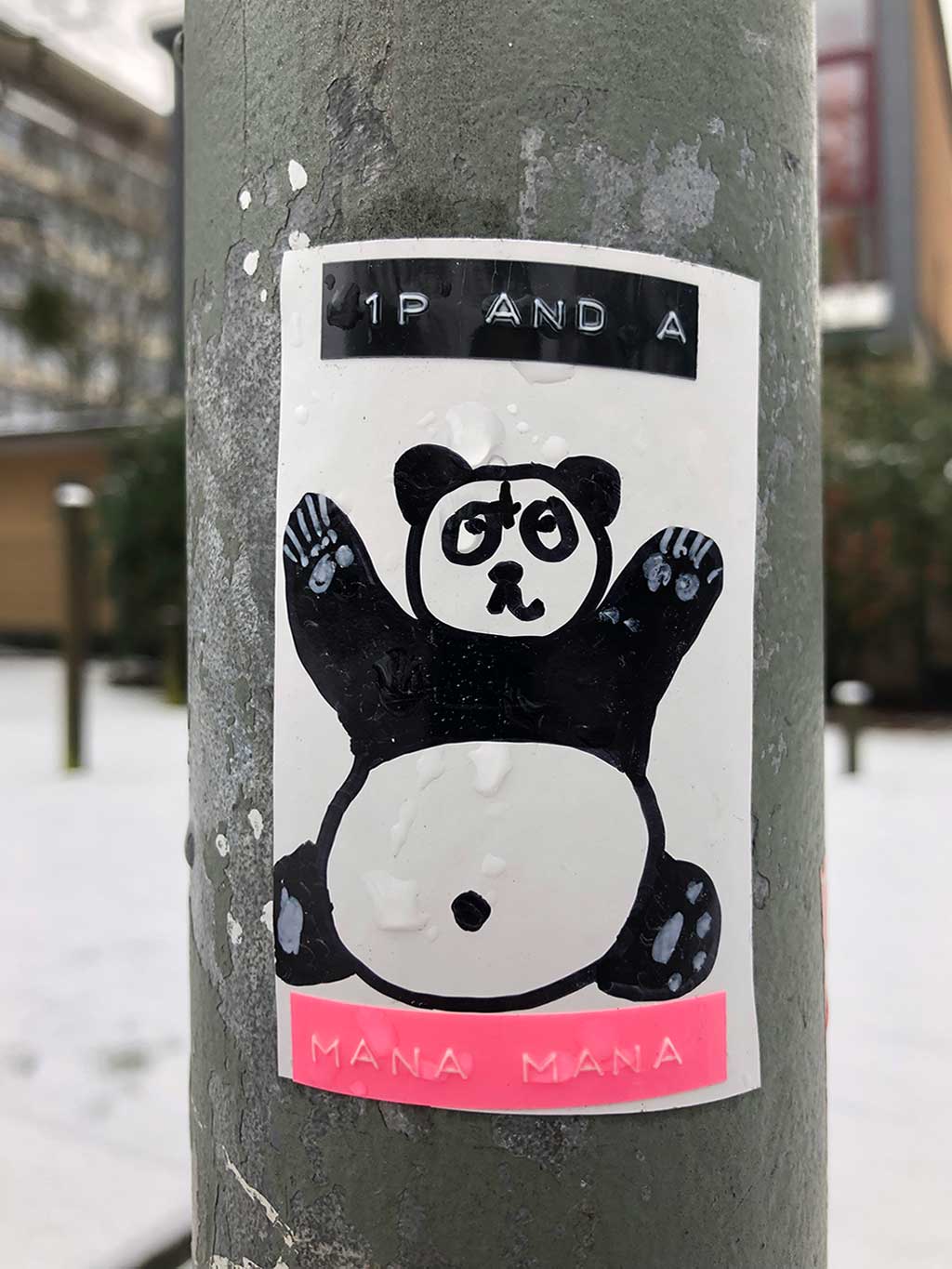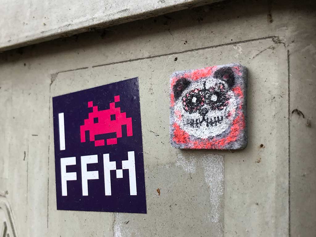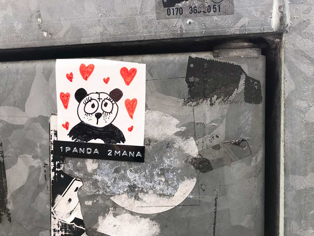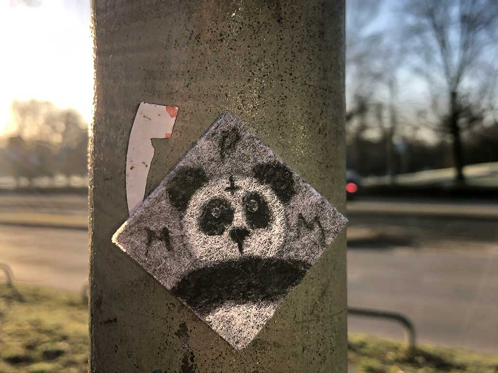 Nach Fuchs, Hase, Hund und Katze nun also Streetart mit dem Panda. Auf 13 Fotos, die zwischen 2010 und 2022 in Frankfurt am Main aufgenommen wurden, fand das in natura imposante Tier in kleinen Übersetzungen auf Aufklebern, Filz und Stencils den Weg in den städtischen Raum.