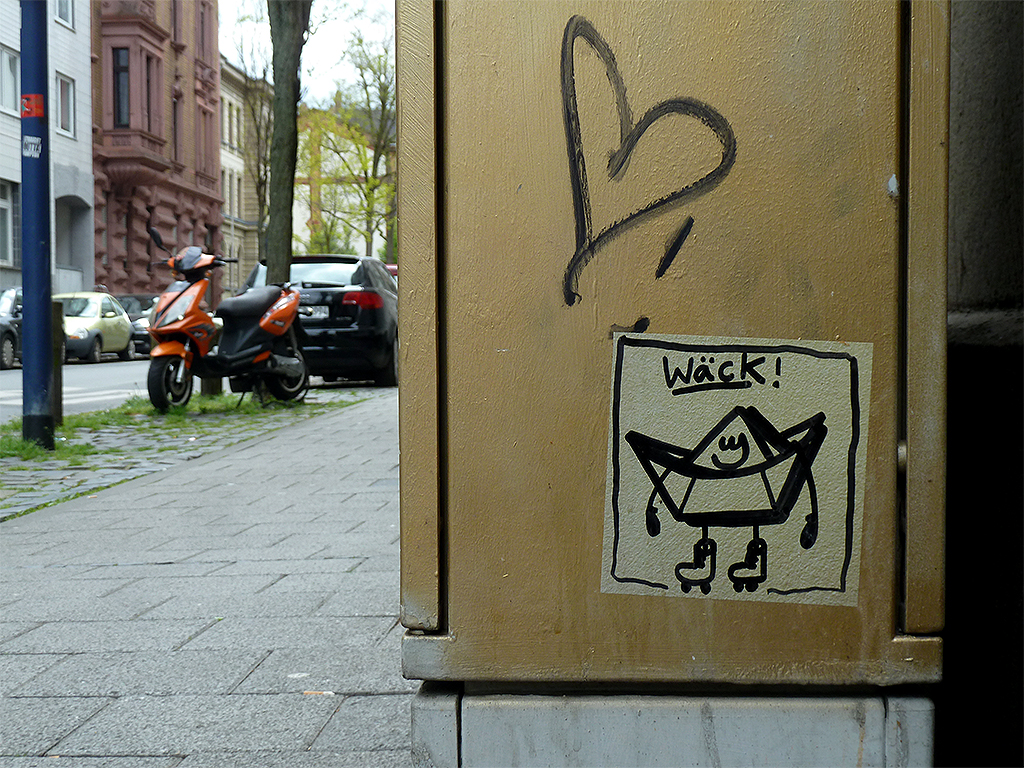 Bereits in den vergangenen Monaten vereinzelt in den Rückblicken für Streetart und Graffiti in Frankfurt sowie Offenbach zu sehen gewesen, tuckert das Friendschiff, und ähnlich gestaltete Figuren, weitehin fleißig vor sich her. Während ich Aufkleber mit dem Papierschiffchen in Frankfurt bisher nur im Bahnhofsviertel gesichtet habe, fiel das Streugebiet in Offenbach deutlich größer aus.