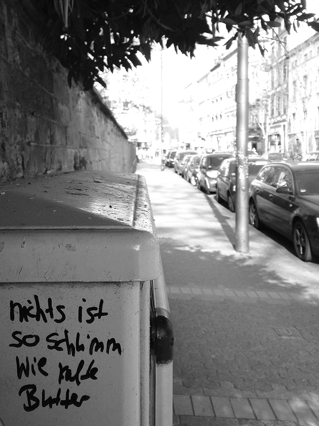 Die Straße spricht… zum Beispiel über Bier, Kakao, kalte Butter, Memes, Nico, Rolf u.v.m. Tags:Frankfurt am MainSprücheStreettalk Frankfurt