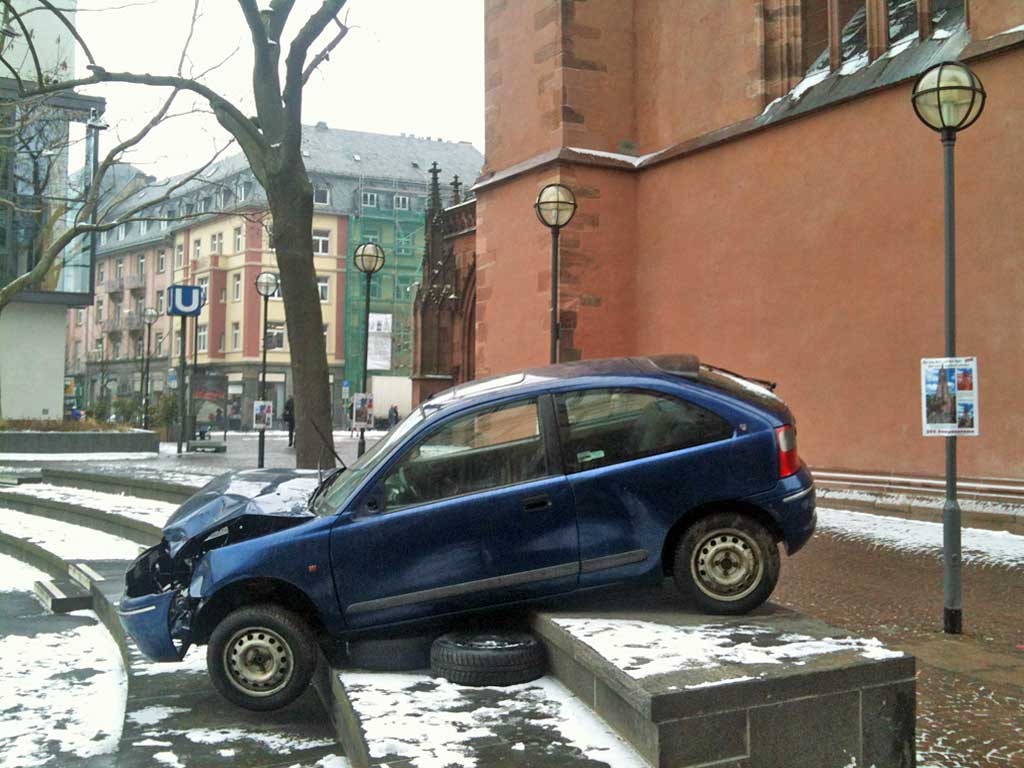 Zwischen Dom, Kunsthalle Schirn und Römerberg lassen sich seit gestern einige umgekippte, verbeulte und schrottige…