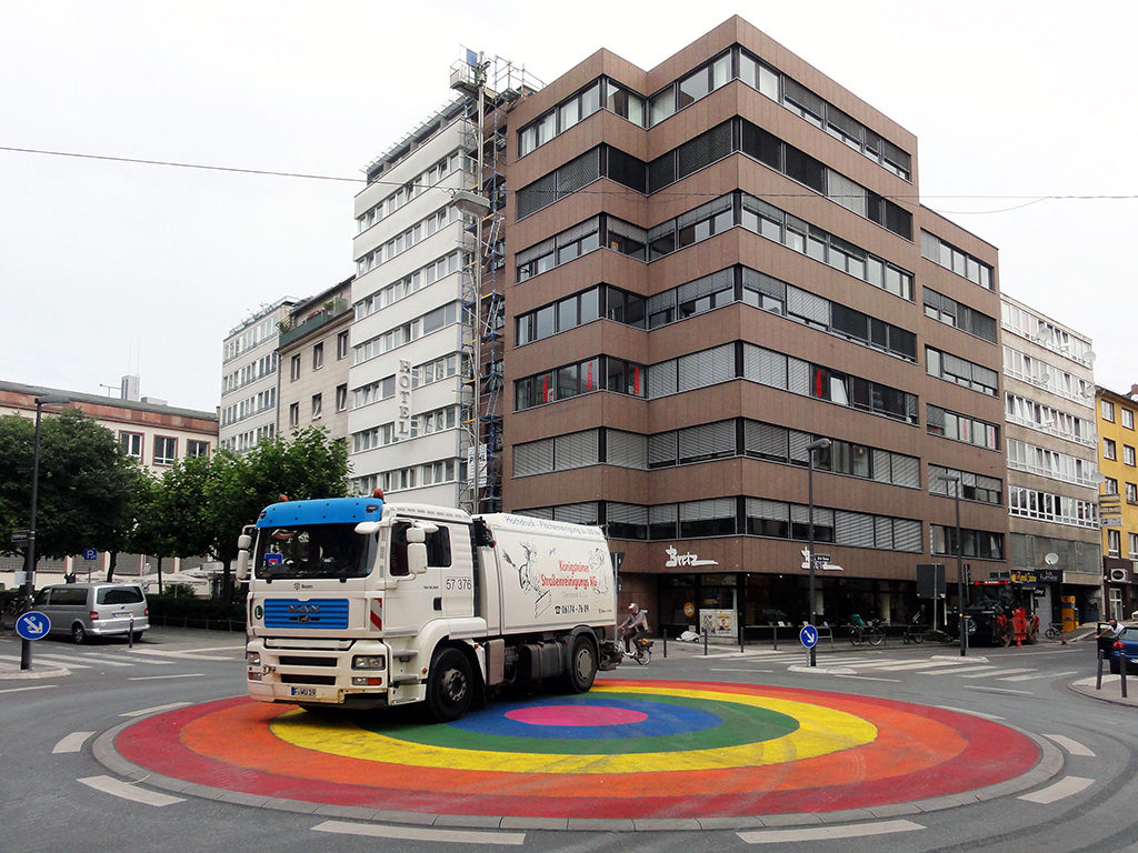 Regenbogen-Kreisel und gleichgeschlechtliche Ampel-Paare zum CSD in Frankfurt