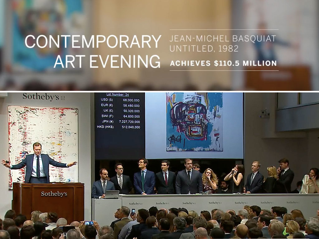 Videozusammenschnitt der Auktion bei Sotheby's, bei der das Werk "Untitled!" (1982) von Jean-Michel Basquiat für…
