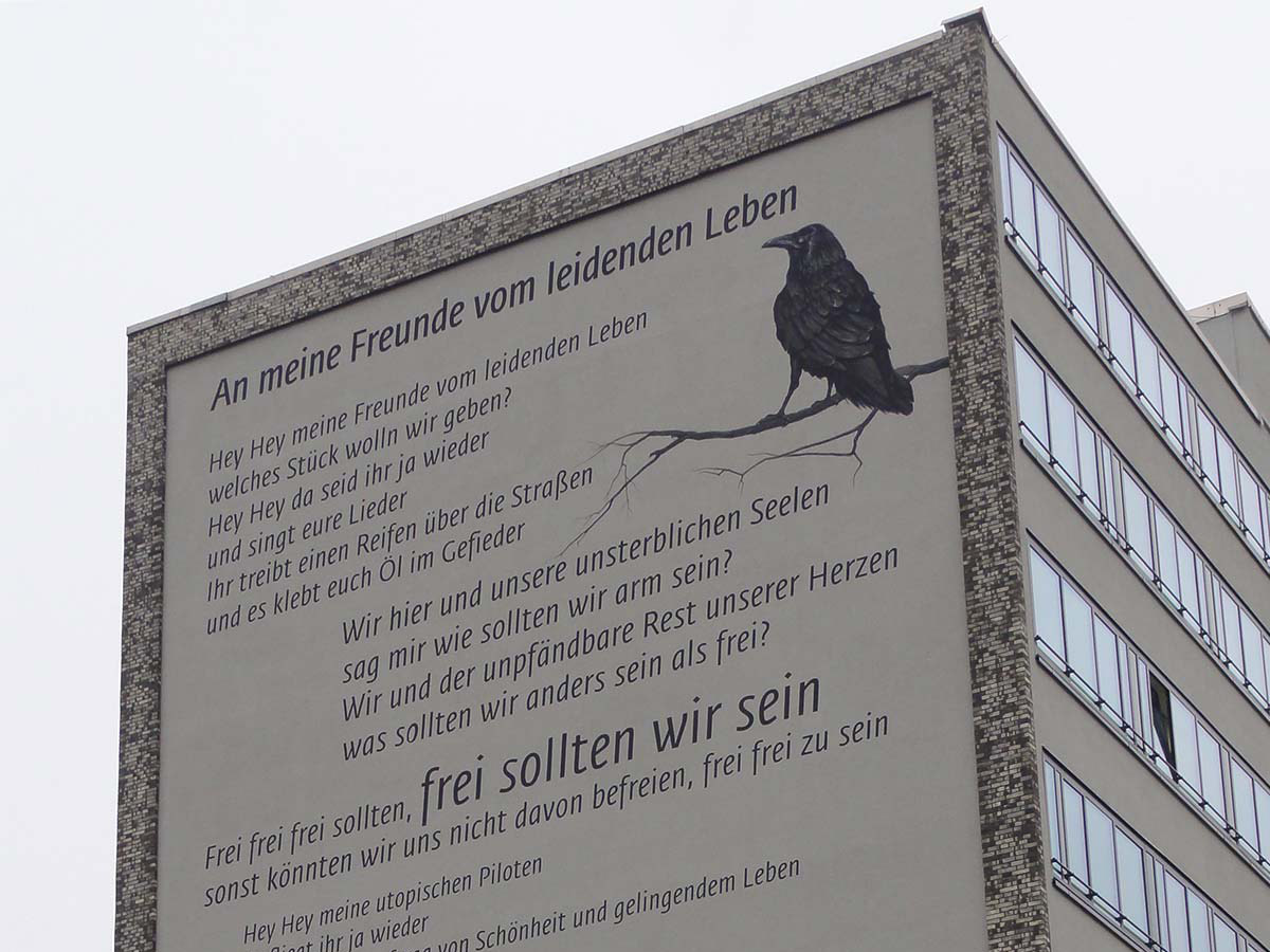 Songtext-Mural von „An meine Freunde vom leidenden Leben“ von Peter Licht an einer Hausfassade in…