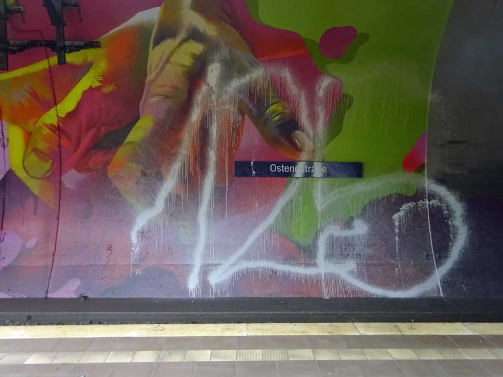 Interessanterweise scheint es aber vor Ort möglich zu sein, die neu gesprühten Graffiti zu entfernen, und das ohne das Hauptwerk in Mitleidenschaft zu ziehen, denn es gibt Stellen, auf denen nachträglich gesprühte Graffiti fehlen und wo neue Graffiti an Stellen gesprüht wurden, an denen bereits zuvor schon Graffiti gesprüht wurden. Das dürfte für eine ordentliche Versiegelung des Auftragsgraffiti in der Ostendstraße sprechen. Hier einige Beispiele dafür: