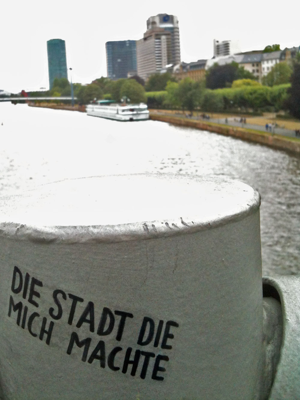 Der künstlerische Ausdruck, oftmals mehrfarbig angebracht und vom Erschaffer möglicherweise als kunst- und anspruchsvoll angedacht, steht nicht im Mittelpunkt der Serie „Notizen zum Stadtbild“, zu der es nachfolgend, bereits zum vierten Mal, eine mehrere Fotos umfassende Auswahl zu sehen gibt. Hier gilt einfach nur das geschriebene Wort, in Form von Statements, Slogans, Zitaten und Botschaften, zu Stadt im Allgemeinen, speziell zu Frankfurt sowie den Bewohnern der Stadt.