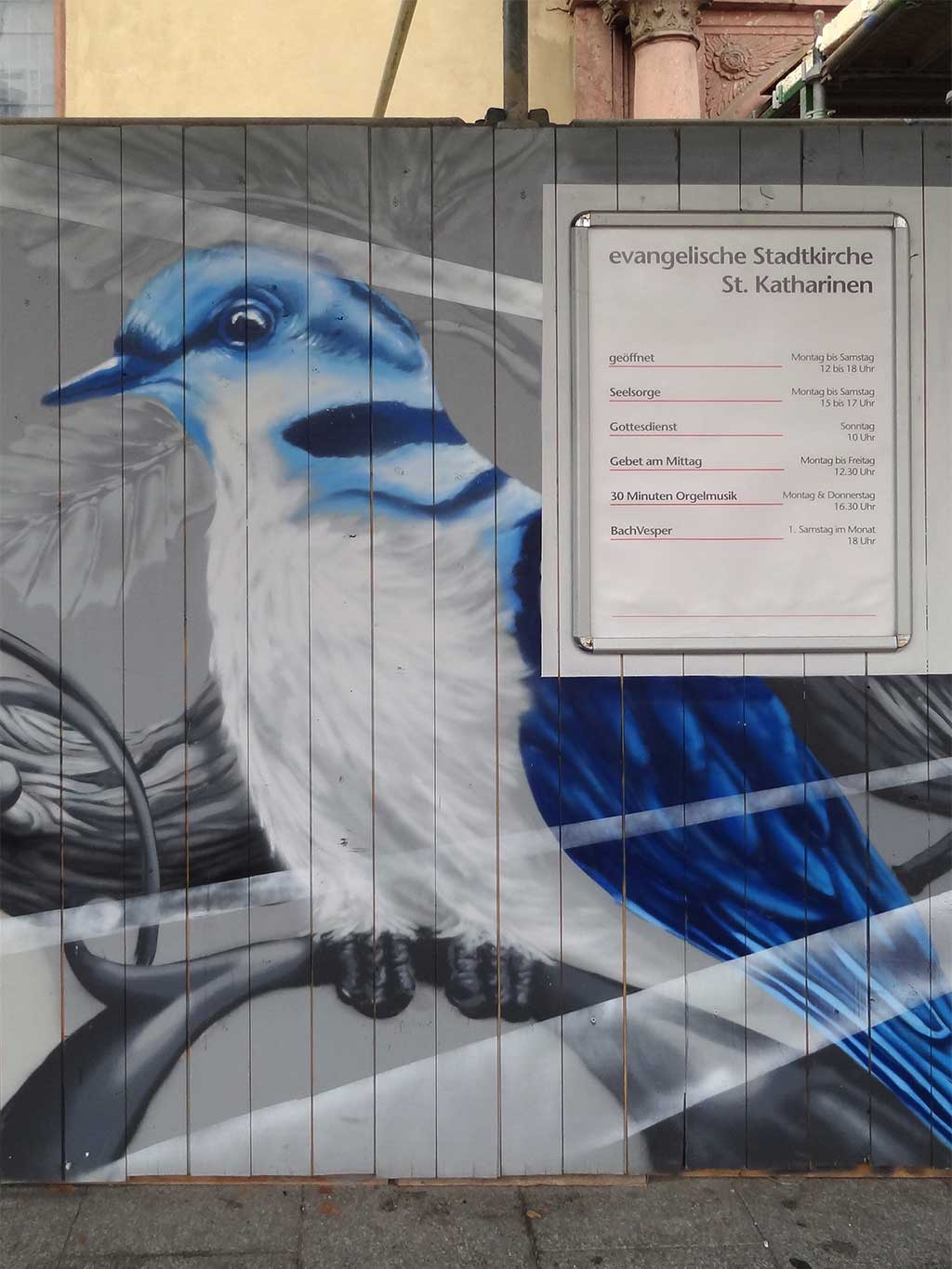 Die Sanierungsarbeiten an der Katharinenkirche in der Frankfurter Innenstadt haben begonnen. Die Westseite am vor der Kirche aufgestellten Bauzaun hat Jan Malte Strijek alias Honsar bemalt. Zu sehen ist ein Konstrukt aus bunten Erdbeeren, Ranken und Wurzeln, dazu ein Kelch direkt am Eingang der Kirche sowie eine Biene und ein Vogel.