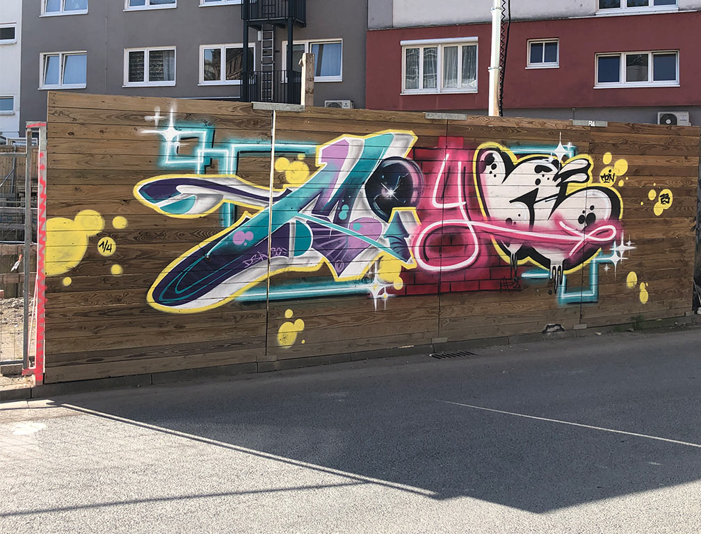 Gemeint ist das als Main Yard firmierende Projekt, das von Beginn an auch mit Urban-Art-Aktionen begleitet wird. Bereits mehrmals bespielt wurde z. B. das Haus mit der Fassade, die in Richtung Straßenbahnhaltestelle „Allerheiligentor“ zeigt und nach der Bauzaun-Bemalung entlang der Lange Straße und Allerheiligenstraße wurde seit Mitte April 2023 in mehreren Steps auch der bisher noch unbemalte Bereich in der Breite Gasse bemalt.