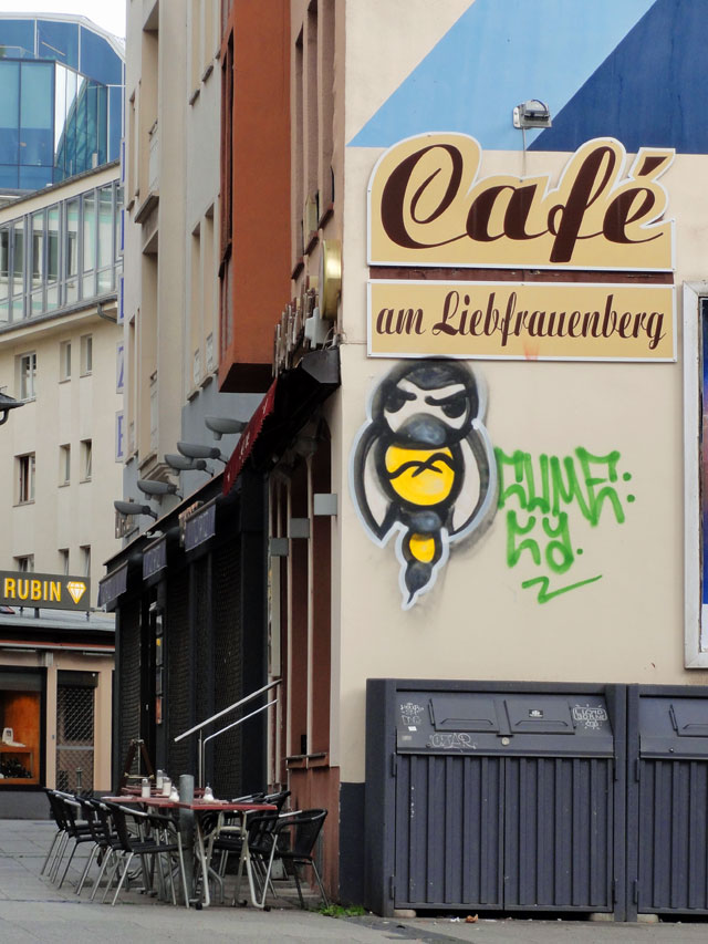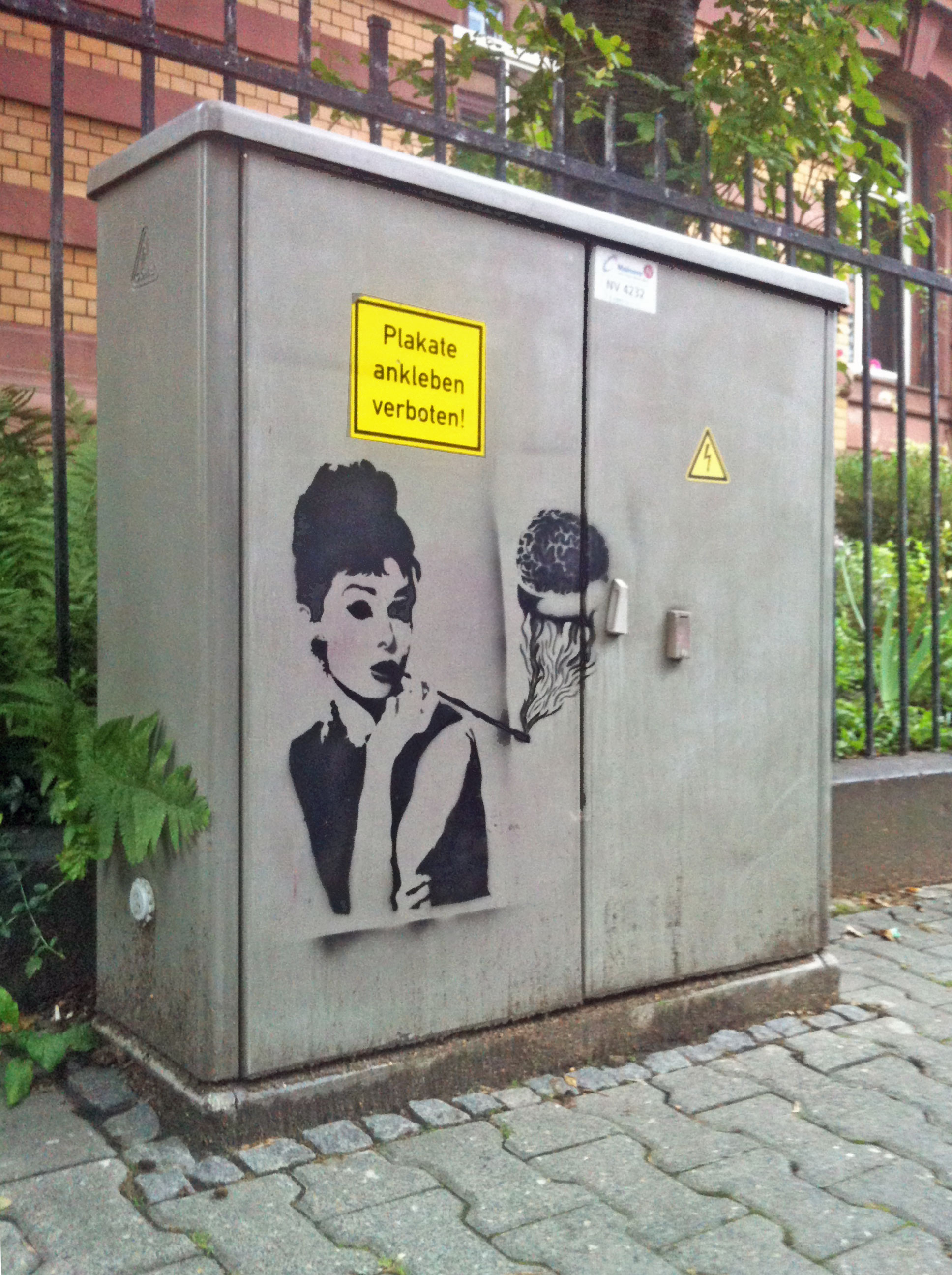Während der August 2014 in Frankfurt wettertechnisch oftmals zu Wünschen übrig ließ, brachten die Straßen zahlreiche neue, bunte und sehenswerte Werke hervor wie sie mir wirklich außerordentlich gut gefallen. Toll, dass sich da draußen immer wieder und wieder Leute finden und in Form von Aufklebern, Schablonen, Fliesen, Graffiti, Slogans usw. ihre Spuren hinterlassen.