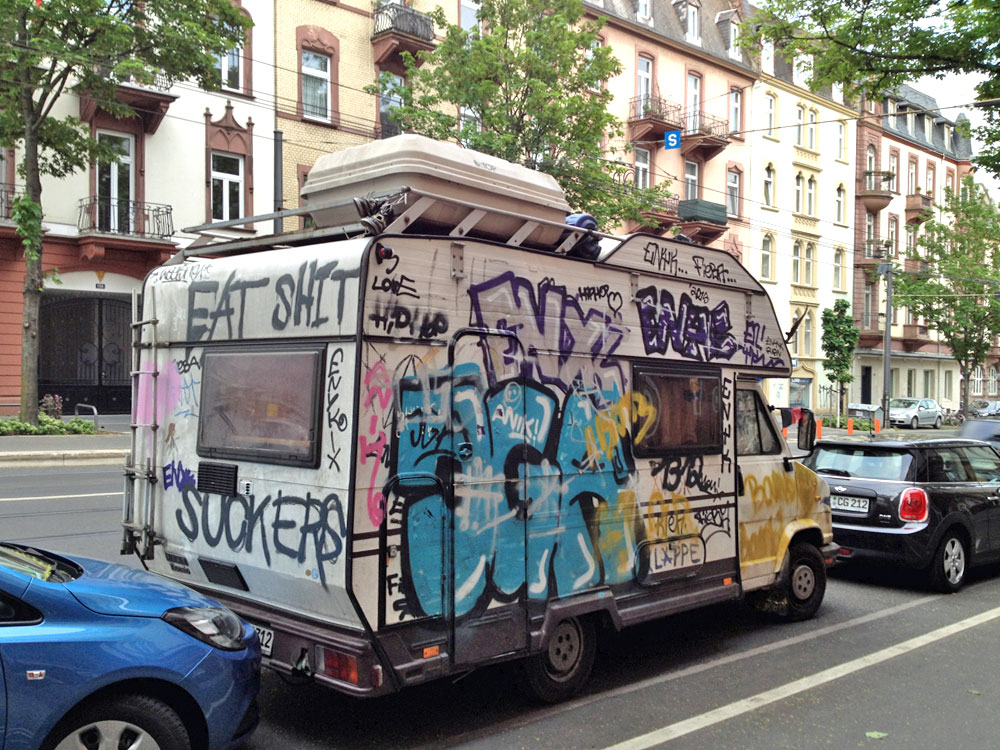 Bretter, Brückenpfeiler, Fliesen, Hausfassaden, Kacheln, Rooftops, Stencils, Sticker, Stromkästen und Wohnwagen – Urban Art in Frankfurt ist nicht nur bunt, vielfältig und kreativ an sich, auch die Wahl des Untergrunds, auf dem geklebt, gemalt und geschrieben wird, ist sehr abwechslungreich.