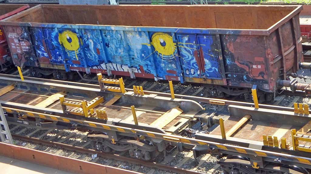 14 Fotos mit Streetart- und Graffitiumsetzungen in Frankfurt am Main, alle aufgenommen im Mai 2018. Diesmal mit Werken, die sich u.a. auf Betonpfeilern, Containern, Fliesen, Giebelwänden, Kacheln, Lkw, Sandsteinmauern, S-Bahnen, Stahlträgern und Stromkästen befanden.