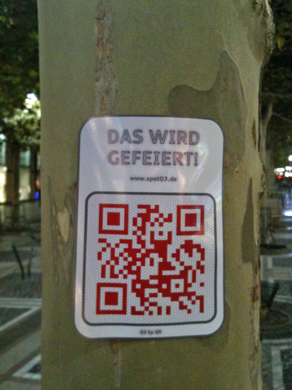 Diese Woche auf der Zeil gesichtet und wie sollte es anders sein, auch hier führt der Scan zu einer Website- dieses mal jedoch nicht zum Produkt- oder Dienstleister direkt, sondern zu dessen Facebooksite. Die Firma die dahinter steckt ist Audi und macht auf den anstehenden Zwischenstopp der Audi Q3 Experience-Tour am 29.11. in Frankfurt aufmerksam- inklusive eines Gewinnspiels.