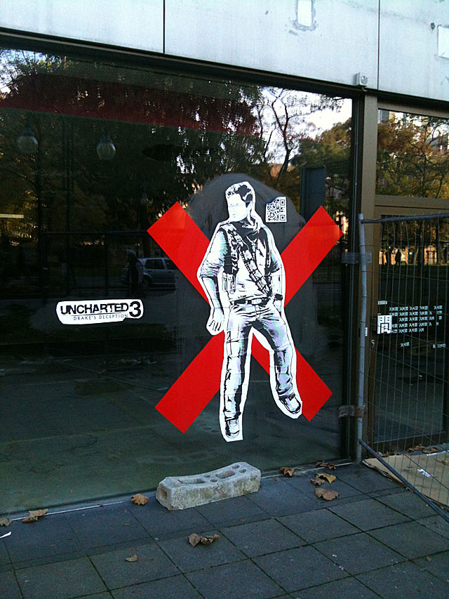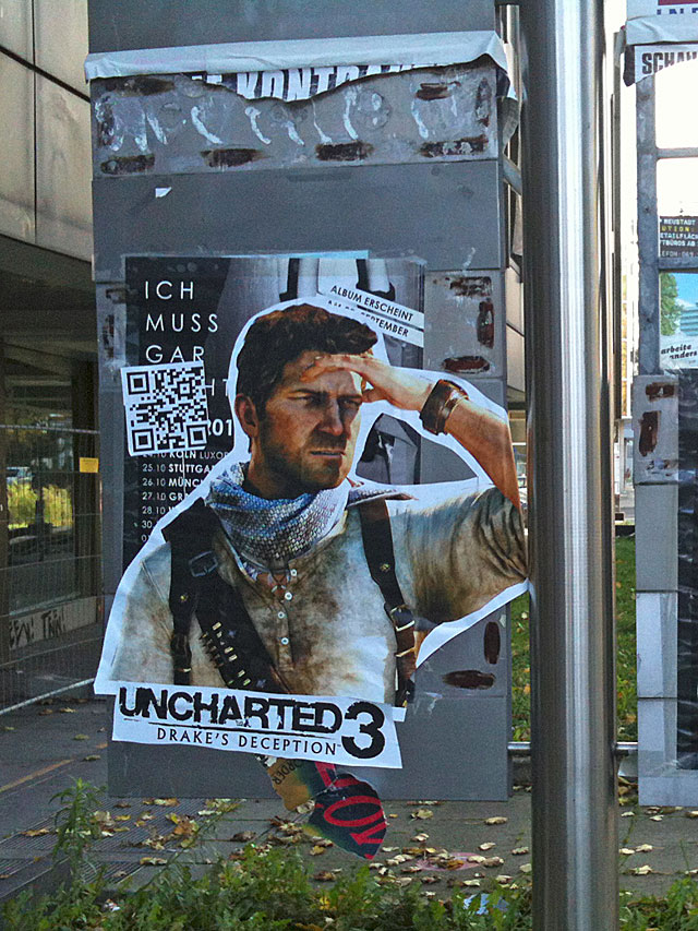 Zuletzt traf man öfter auf diesen Burschen, zumeist im Dreierpack. Figur, Produkttitel und QR-Code. Ein bischen Streetart, ein bisschen Werbung, ein bisschen QR-Code. Wer auf Figuren reagiert: Check. Wer sich trendy fühlt und QR-Codes via Smartphone scannt: Check. Und wer einfach nur das Wesentliche (hier: Name/Titel) auschnappen will: Check. So zumindest mein Eindruck, dieser Werbeaktion zum Release des Playstation 3-Spiels Uncharted 3.