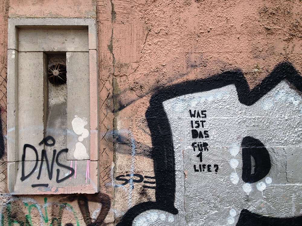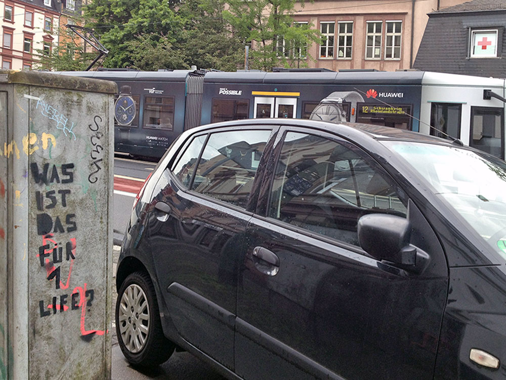 Im Februar dieses Jahres bin ich beim Blog von Frankfurt Maximal zum ersten Mal auf dieses „Was ist das für 1 Life?“ gestoßen und dachte mir nichts weiter dabei. Ein Spruch, bzw. in diesem Fall eine Frage, wie man sie des Öfteren als Randnotiz bei Graffitis sieht, so auch im Falle von „GUDE“ auf einem Waggon der Linie S5 Frankfurt (Süd) – Friedrichsdorf (Taunus). Anfang April wurde „Was ist das für 1 Life?“ bei gutefrage.net thematisiert und landete von dort aus wenige Wochen später auf vielen größeren Blogs (z.B. Kotzendes Einhorn und Dressed Like Machines) und folglich dann auch irgendwann in den Sozialen Netzwerken, wo solche Dinge oftmals als Letztes ankommen, dann aber völlig bemüht lustig und bis zum Erbrechen durchgenudelt werden. Jetzt, nochmal zwei Monate später, hat offenbar jemand die Kunst der Stencils für sich entdeckt und hinterlässt das „Was ist das für 1 Life?“ im Frankfurter Stadtgebiet.