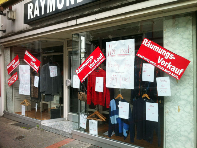 Im mittleren Abschnitt der Berger Straße sieht es wie folgt aus: Die vom Bekleidungsgeschäft Bon Bon hinterlassene Ladenfläche steht weiterhin leer und dort, wo einst der Schreibwarenladen Mc Paper raus ist, um auf die gegenüberliegende Seite zu ziehen, lässt ein neuer Mieter ebenfalls noch auf sich warten. Und den Raymund Herrenmode scheint es auch nicht mehr lange zu geben..?