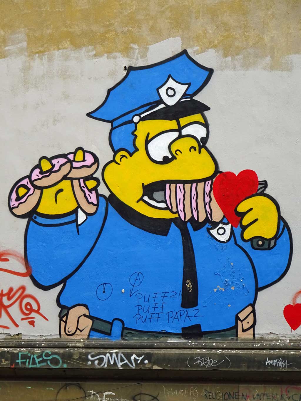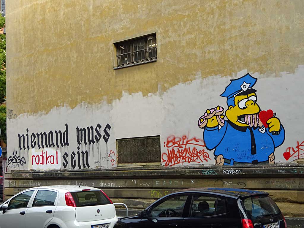 Im Juni 2018 hat dann irgendjemand das Wort „Bulle“ übermalt bzw. geschwärzt. Und das blieb zunächst auch so. Niemand füllte die Lücke wieder aus, mit welchem Wort auch immer. Dieser Zustand hielt rund zwei Monate. Im August war der „Bulle“ dann wieder Teil des Wandbildes. Und nochmals zwei Monte später, am 11. Oktober 2018, wurde der „Bulle“ mit dem Wort „radikal“ ersetzt und die Pistole von Chief Wiggum mit einem Herz übermalt.