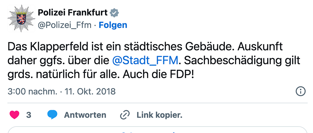 Ja, schon ein lustiger Haufen, der da unter Lindner zum Vorschein kommt. Erst bundespolitisch sich aus der Verantwortung stehlen und hier in Frankfurt auf den von ihnen selbst eingebrachten Denkmalschutz scheißen und selbst zur Tat schreiten. Das Aushalten von anderen Positionen, hier in Form eines Zitats, das genauso wenig wie der Song selbst verboten ist, scheint für die FDP zu viel des Guten zu sein.