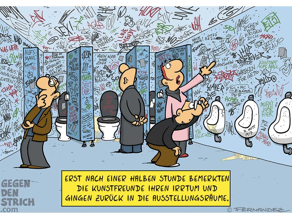 Nicht selten schmücken Kunstwerke die Wände von Cafés, Bars und Restaurants. Die witzigsten ihrer Zunft, in der Regel in Form von Cartoons, hängen in Frankfurt-Bornheim in der Gaststätte „Henscheid“ und sorgen auch nach mehreren Besuchen immer wieder für Lacher. Unter dem Titel „Wenn Gott Deutscher wäre“ sind seit Oktober vergangenen Jahres Cartoons von Miguel Fernandez ausgestellt, darunter auch ein Werk, in dem Ausstellungsbesucher die zugetaggte Toilette mit der eigentlich ausgestellten Kunst verwechseln.