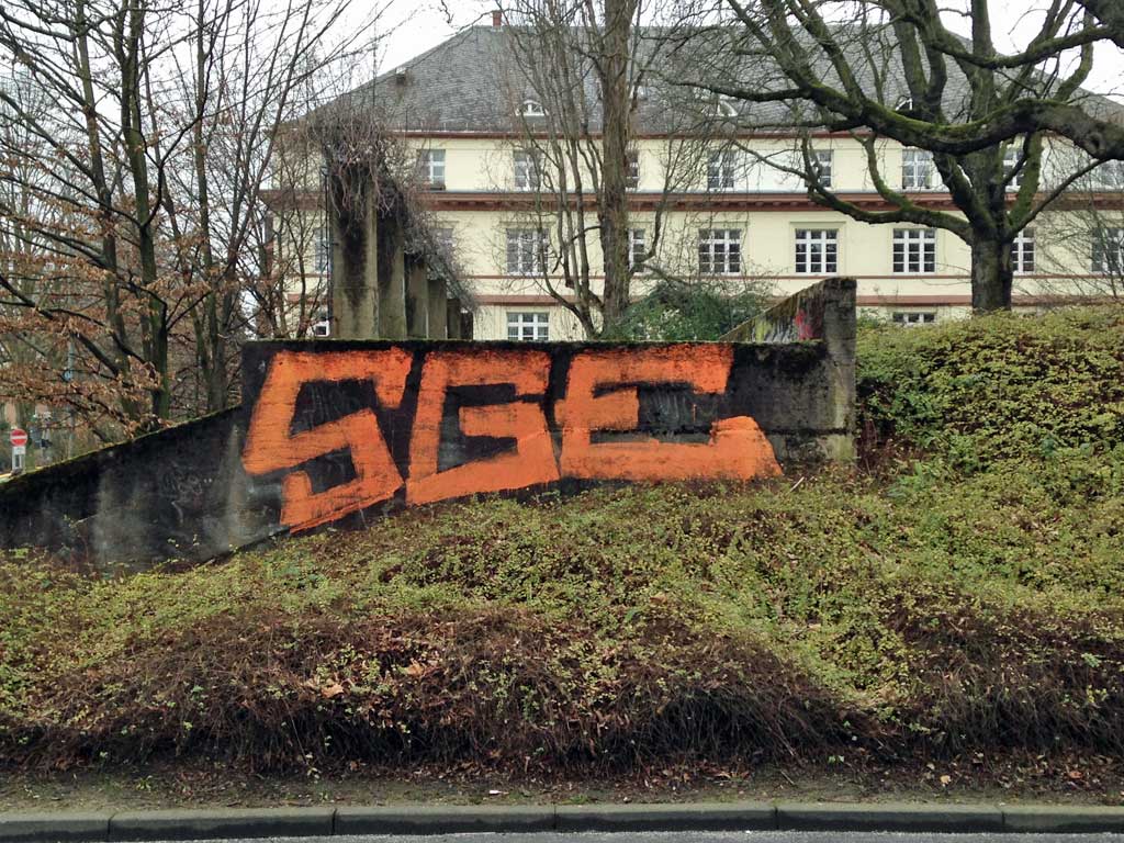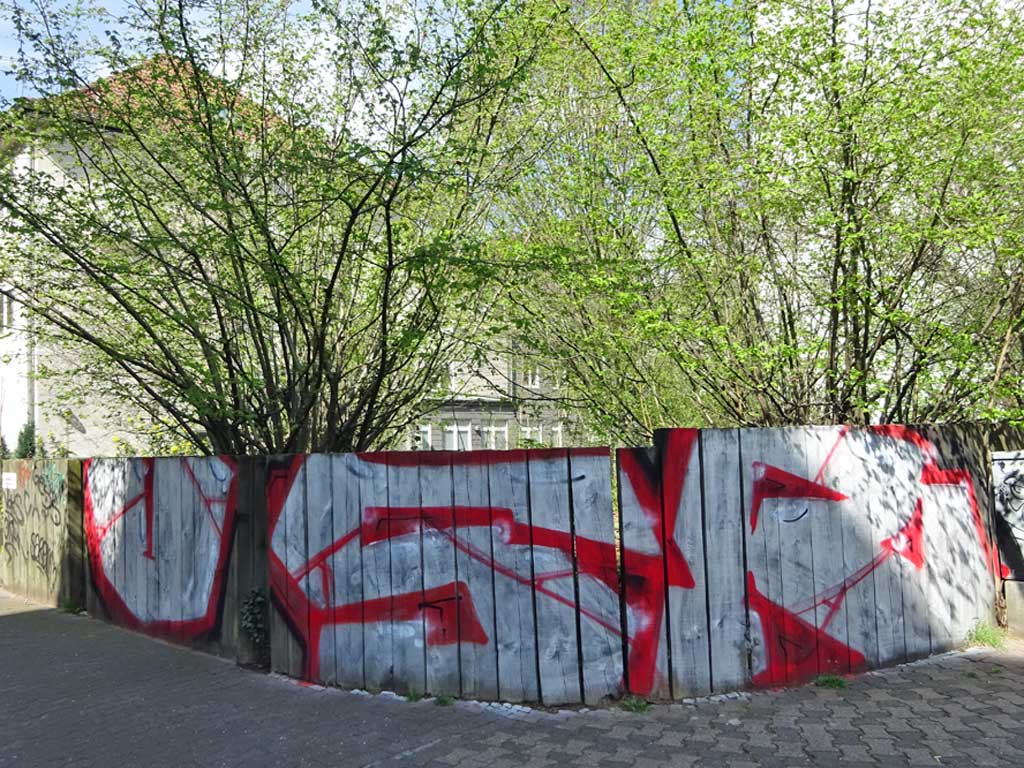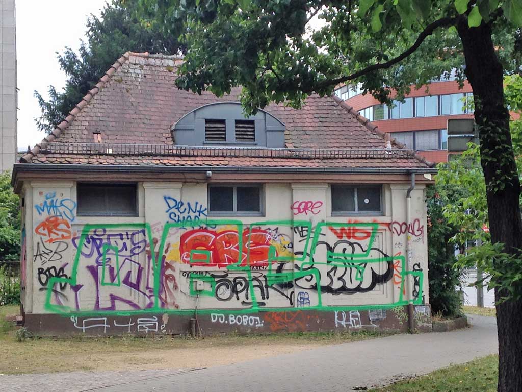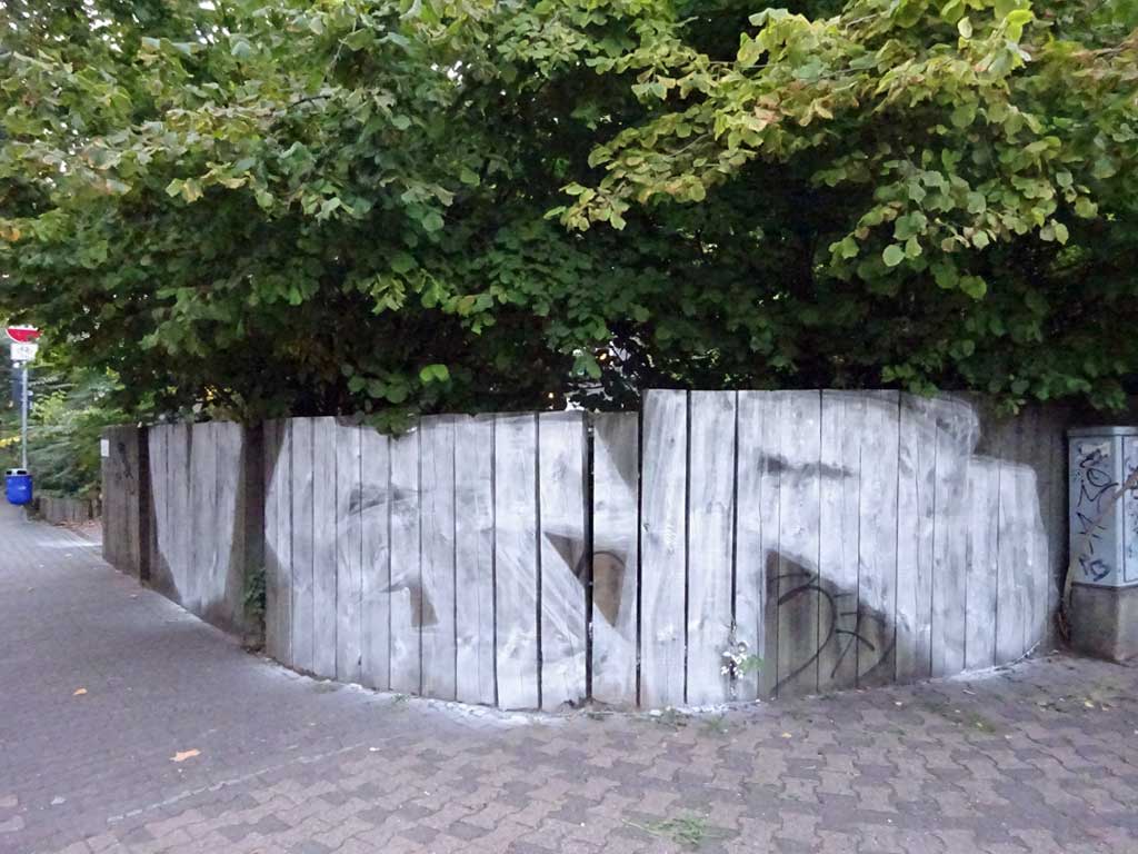 Auch im folgenden Beispiel wurde ein Graffiti angefangen. Diese Fläche wurde aber dann mit einem völlig anderem Schriftzug in Beschlag genommen.