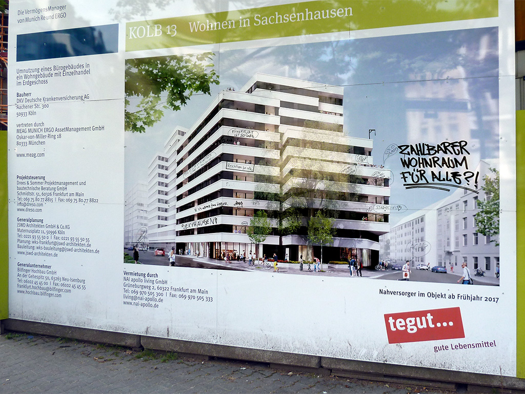 Kolb 13 ist ein Projekt in Frankfurt-Sachsenhausen, dass ein Bürogebäude in „ein Wohngebäude mit Einzelhandel im Erdgeschoss“ umwandelt. Der Wohnraum reicht von 1 bis 6 ZW und 23 bis 220 m² sowie preislich von 530 bis 5.000 €. Ob das als „Zahlbarer Wohnraum für alle“ durchgeht, wie es auf der Infotafel vor dem Gebäude gefragt wird?