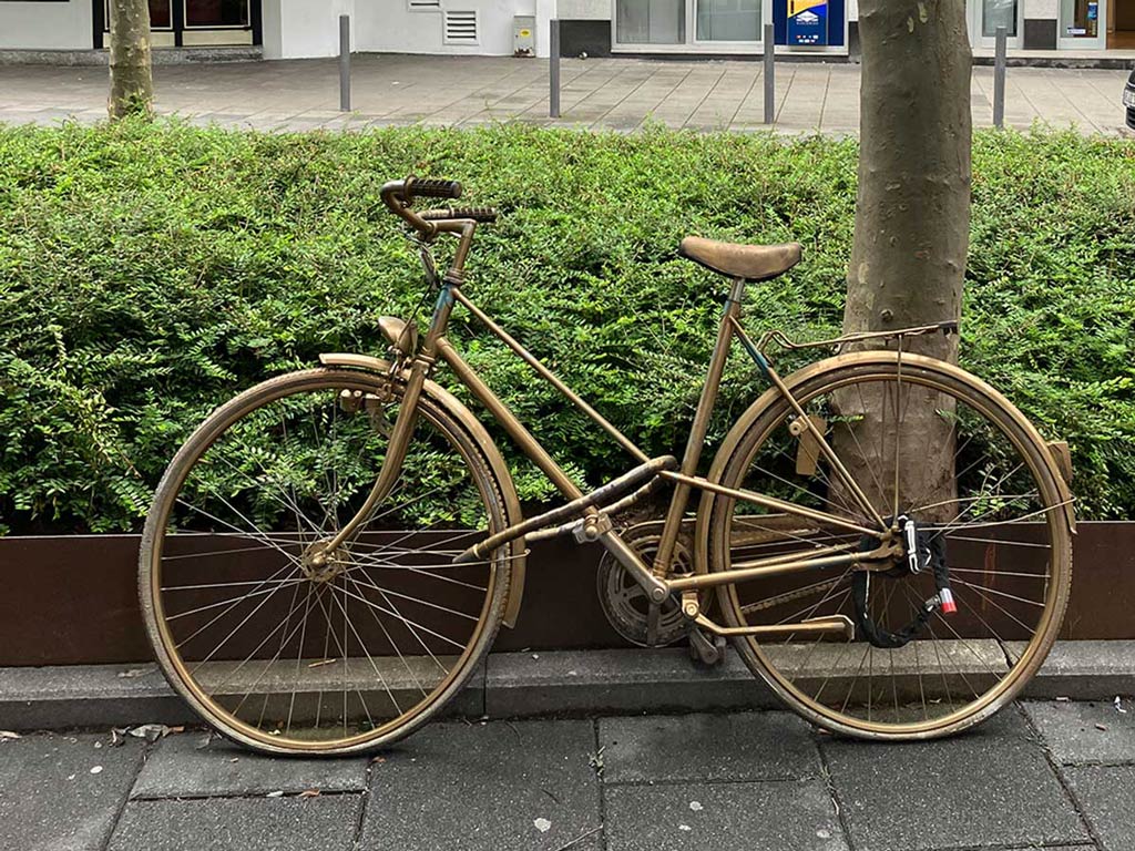 Erinnert sich noch jemand an die goldfarben lackierten Fahrräder, die zwischen April und Juni dieses Jahres in der Stadt zu sehen waren? Im Stadtteil Bornheim habe ich ein neues, auffällig präpariertes Exemplar entdeckt, an dem im Gegensatz zu den vorherigen allerdings auch ein laminiertes DIN-A4-Blatt befestigt wurde. Der mit der Überschrift „Zum Golde drängt, am Golde hängt doch alles“ versehene Text lautet wie folgt: