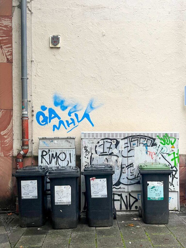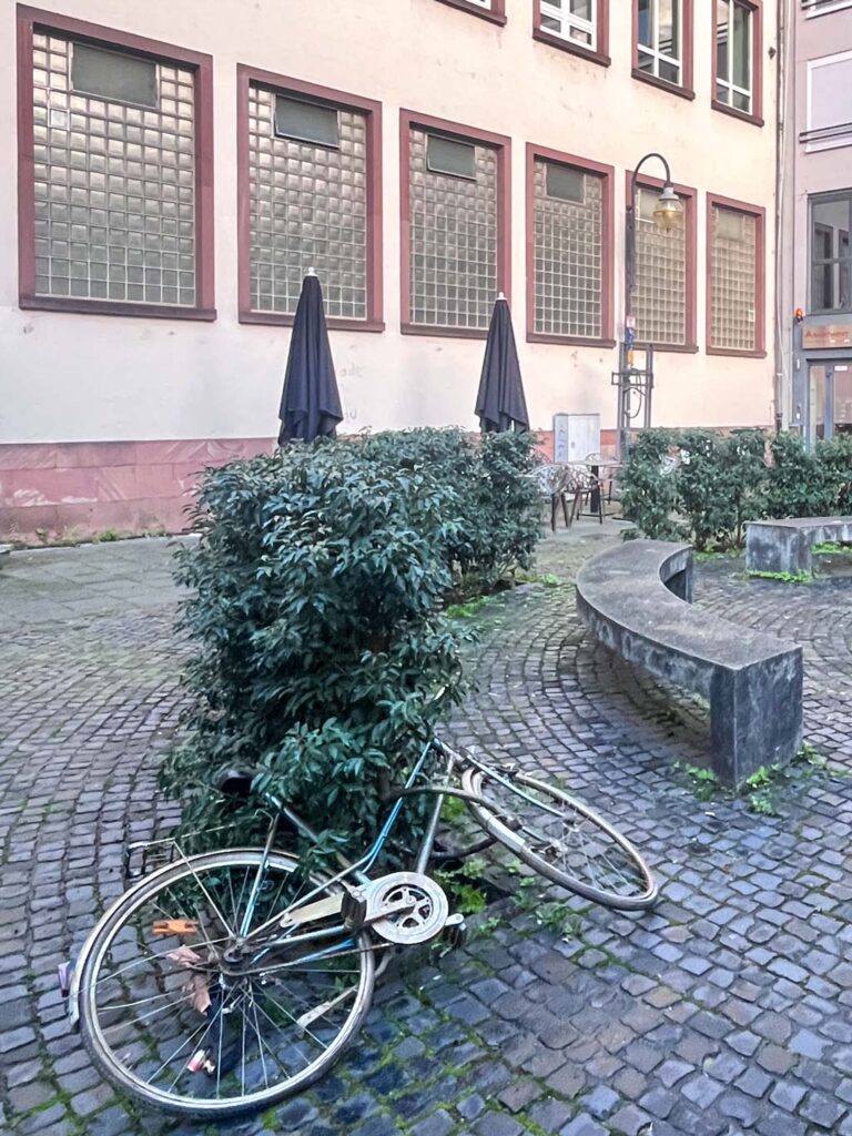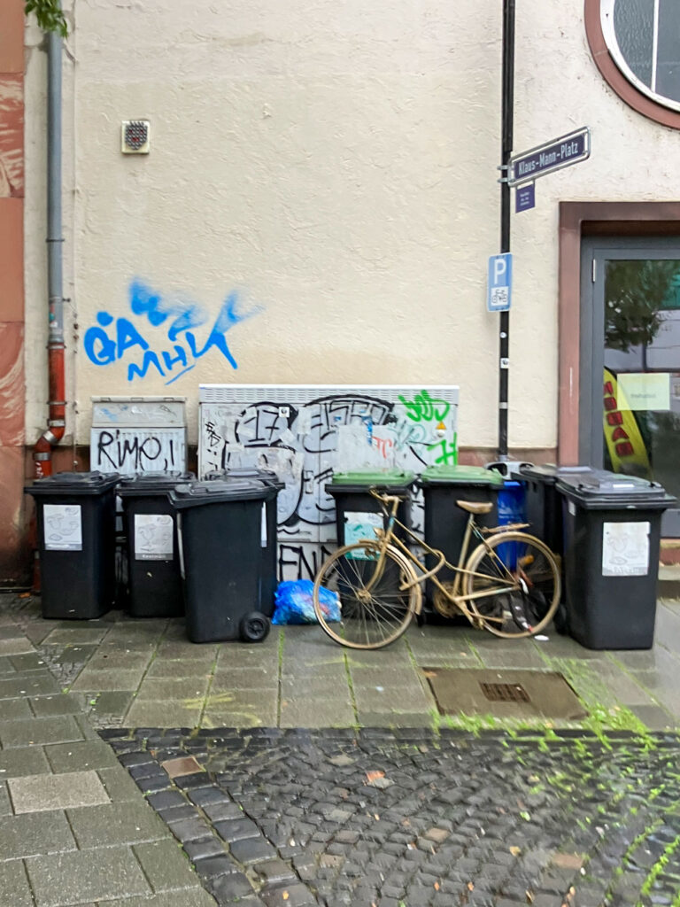 Nur kurz bevor ich dieses Fahrradwrack in Bornheim entdeckte, fiel mir wieder eines in der Innenstadt auf, das bereits seit der ersten Welle, also monatelang, dort steht. Die Stadt Frankfurt hatte Ende April(!) in einer Mitteilung von einem externen Dienstleister berichtet, der sich um das Entfernen dieser Bikes kümmern sollte. Allerdings steht seit jeher ein solches vor dem Kino „Eldorado“ und wurde bisher nicht entfernt. Vor wenigen Tagen dann das: Es ist weg! Wahnsi… nee, doch nicht. Es steht einfach nur einige Meter weiter, aber direkt bei den dort aufgestellten Mülltonnen. Na dann wird es ja demnächst entsorgt. Nächster Tag. Einige Mülltonnen fehlen, wurden vermutlich geleert und wieder weggebracht. Das Fahrrad ist auch w… nee, doch nicht. Er liegt wenige Meter entfernt davon auf dem Boden. Und Tage später wieder ordentlich hingestellt. Und nochmal Tage danach wieder auf Boden – auch heute Morgen noch. Es bleibt spannend.