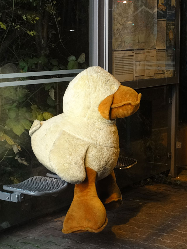 Hahaha, die Ente hab‘ ich mit einem Kumpel sonntagmorgens an der Haltetstelle gefunden und sie mit der Rolltreppe zur B-Ebene der Habsburger geschickt, vielleicht hatte sie so mehr Glück um an ihr Ziel zu gelangen ;)